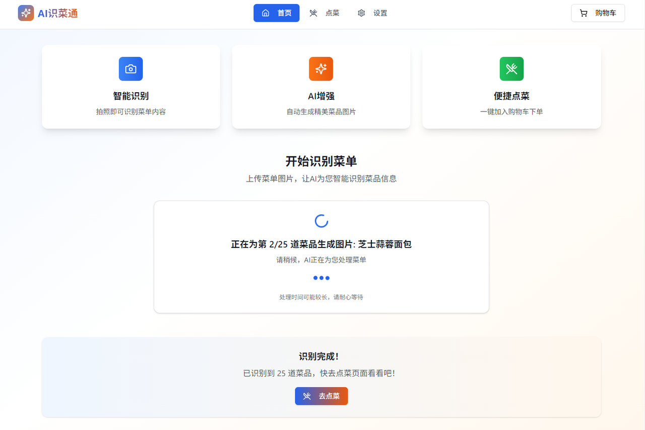 菜单识别完毕之后,首页会提示,点击去点菜即可看到生成的中文菜单