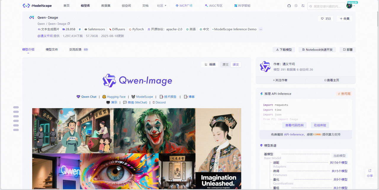 在Qwen/Qwen-Image的模型介绍界面右侧可以看到魔搭社区和通义千问官方给出的推理 API-Inference代码示例