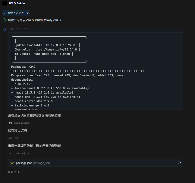 Solo不仅会自动定义需要实现的要点和任务,还会初始化项目基础架构——包括下载依赖、配置环境等全部打包完成,无需你操心;更重要的是,Solo严格遵循上下文工程理念,始终根据当前项目状态整合所有信息进行开发,因此在开发过程中,若发现方向有误或需要补充,你可随时打断并输入新需求,Solo会无缝衔接,绝不会因中断而影响开发连贯性与进度。