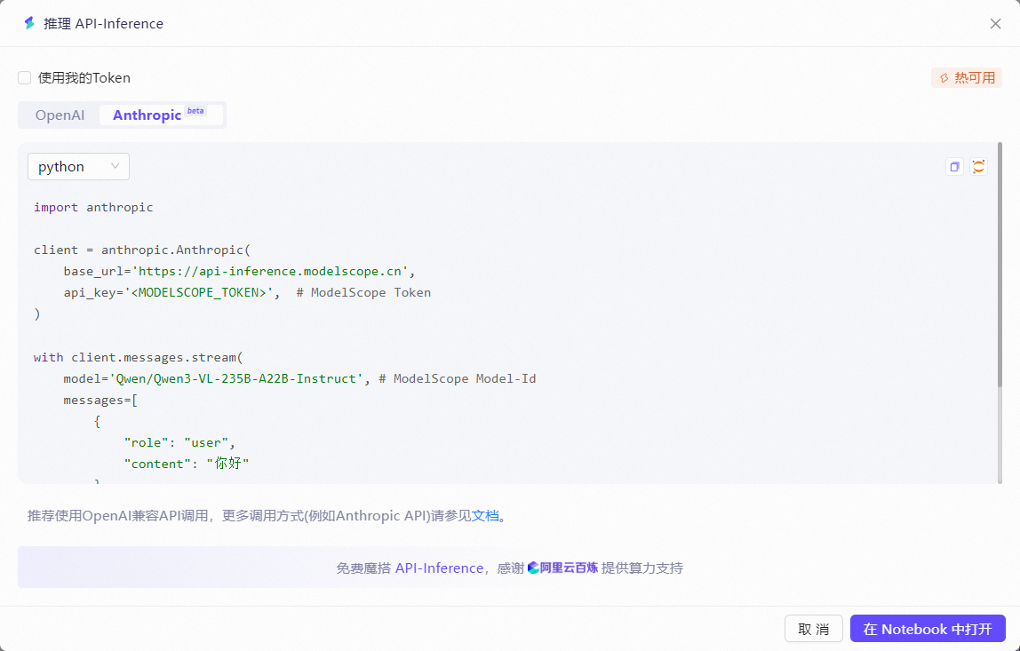 魔搭通过API-Inference,将开源模型服务化并通过API接口进行标准化,让开发者能以更轻量和迅捷的方式体验开源模型,并集成到不同的AI应用中,从而展开富有创造力的尝试,包括与工具结合调用,来构建多种多样的AI应用原型。