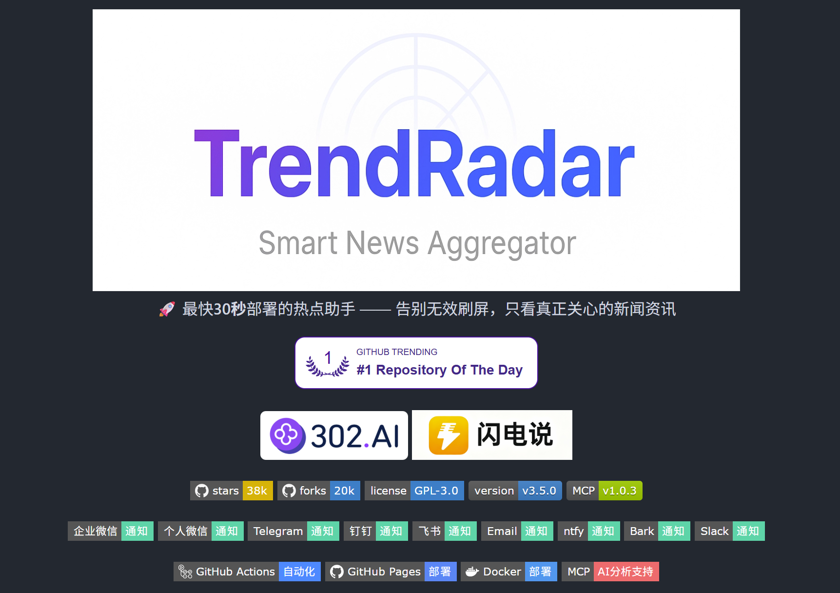 TrendRadar 实时抓取 35+ 平台热点,通过 AI 分析热度变化、生命周期、跨平台传播,支持自定义关键词与多种推送方式。