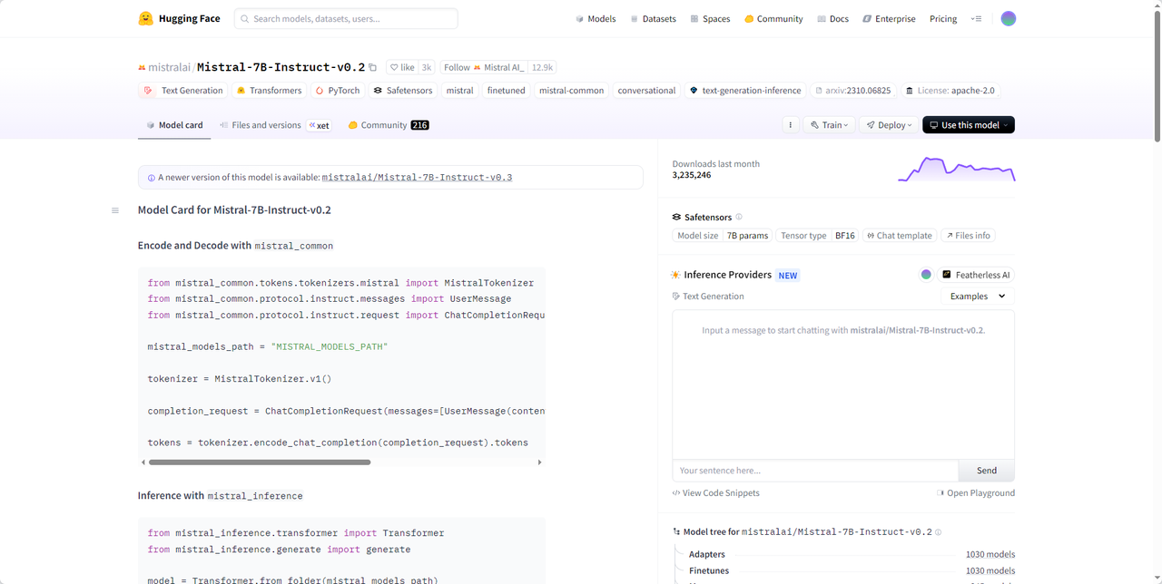 在昇腾 NPU 上高效运行大语言模型,第一步也是最关键的一步,是确保模型能被完整下载、正确加载并顺利迁移至 NPU 设备。我们选择的模型是开源社区广泛认可的 Mistral-7B-Instruct-v0.2——一个基于先进架构、支持 32K 上下文、性能媲美 Llama-2-13B 的 70 亿参数指令微调模型。