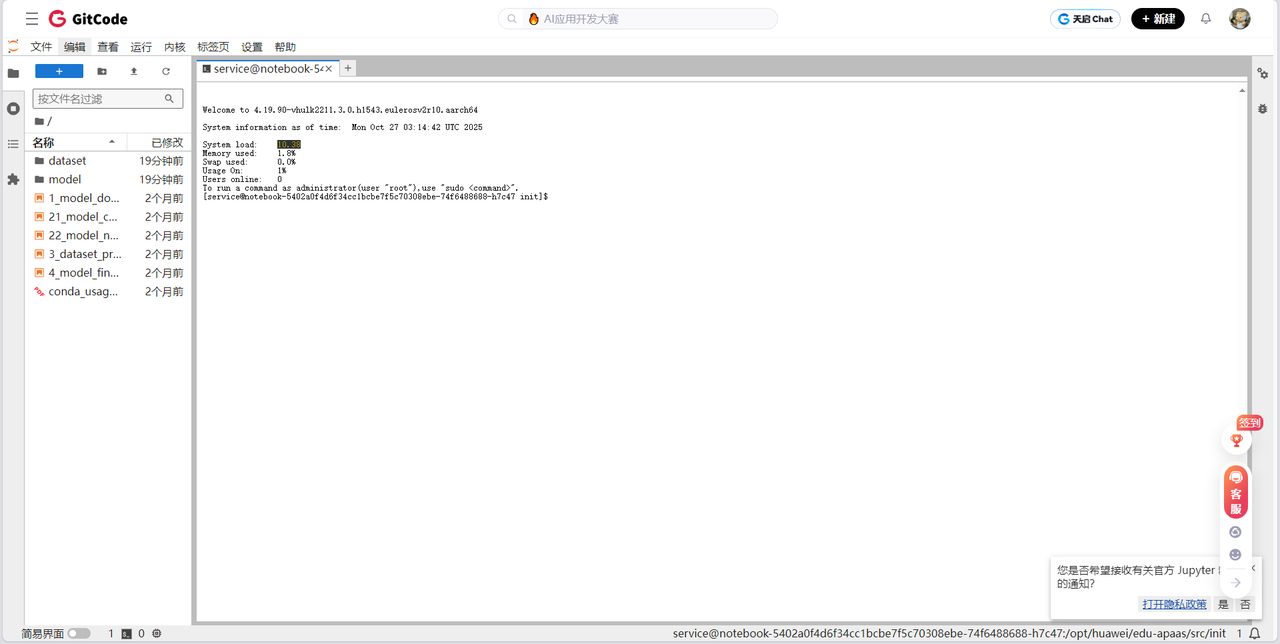 尤其在昇腾NPU领域,GitCode提供了一种极具突破性的体验路径:无需购买任何硬件,也无需复杂配置,开发者只需完成简单注册,即可申请限时免费的云端昇腾算力资源——例如搭载昇腾910B NPU、64GB内存的实例,直接用于运行Llama等主流大模型的推理任务。这种“开箱即用”的云端环境,预装了适配昇腾的软件栈(如Euler OS、PyTorch 2.x兼容环境或MindSpore框架),让用户从“想试试”到“跑起来”只需几分钟。