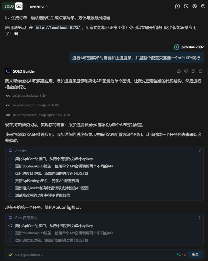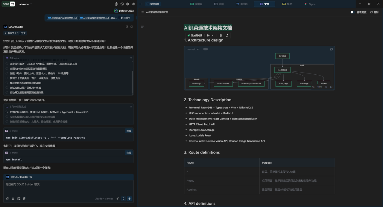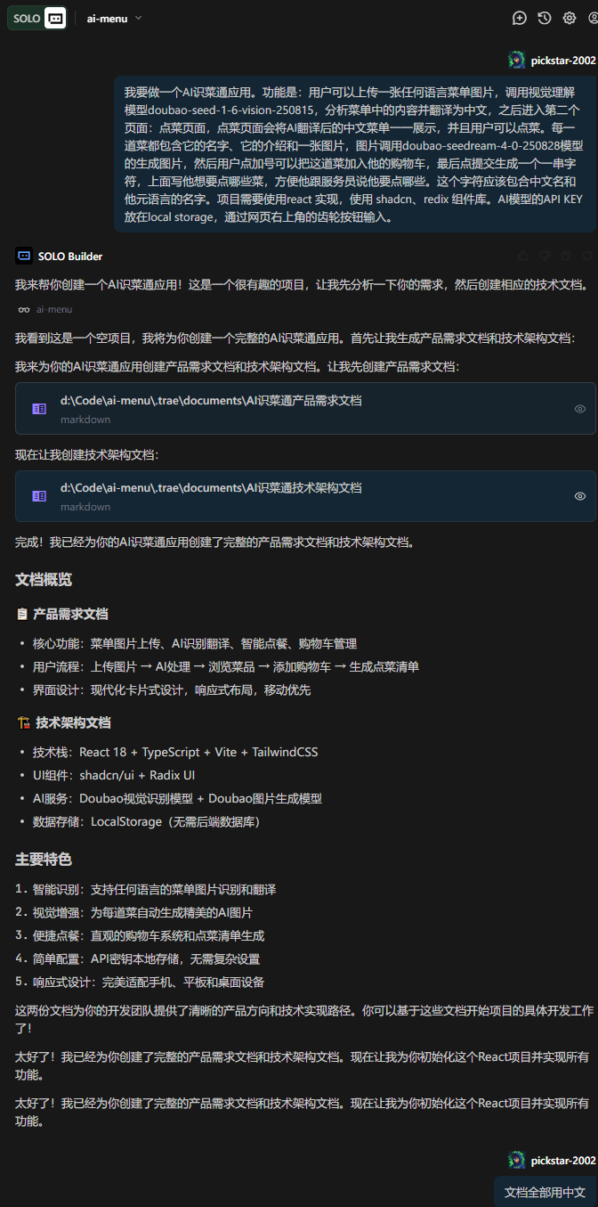 文档其实就是Trae对整个项目的理解,这个修正过程是很有必要的,在确保Trae完全理解了我们的意思,也就是确认文档无误之后即可向Trae Solo发出命令:按照文档进行开发!