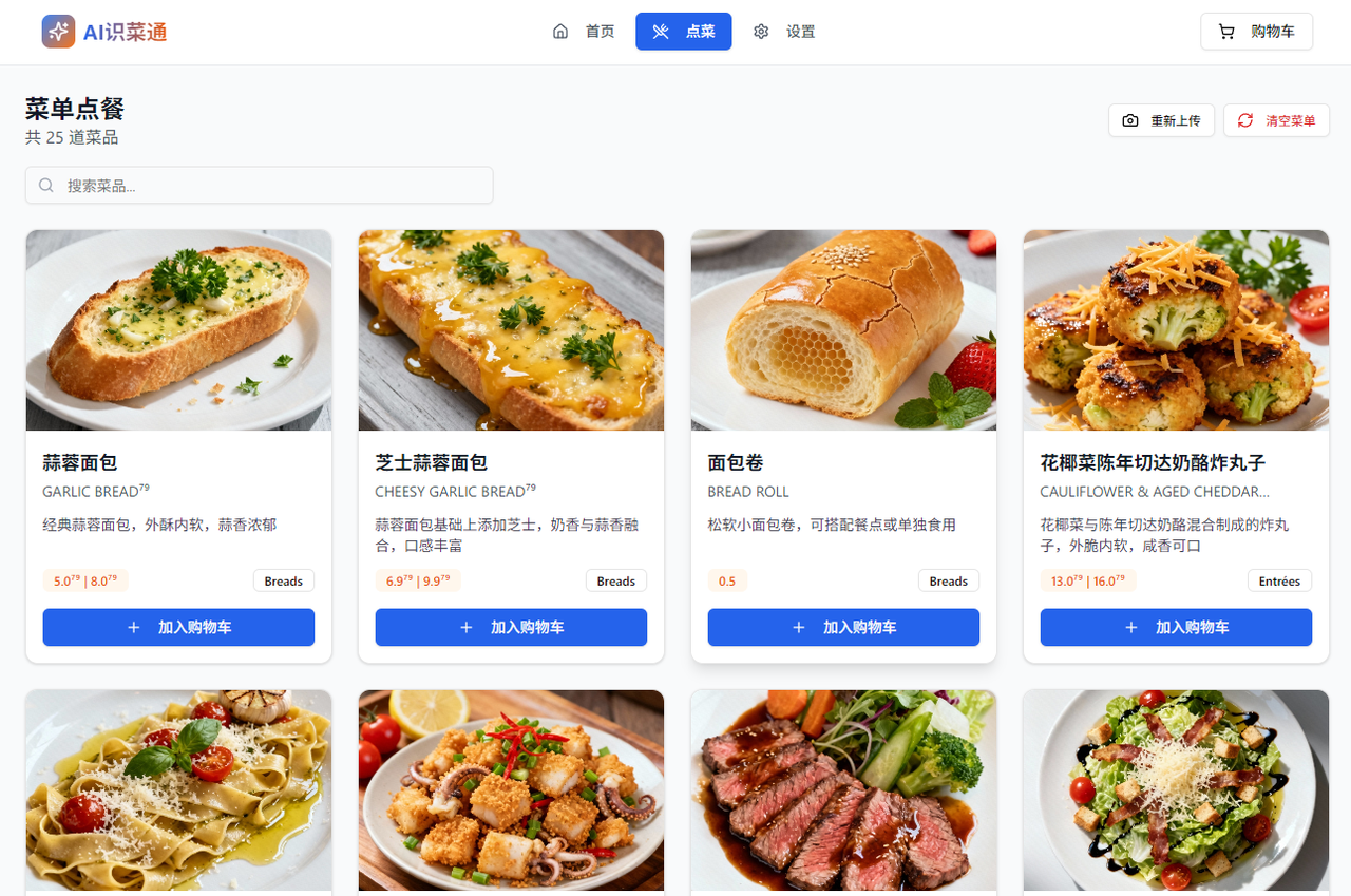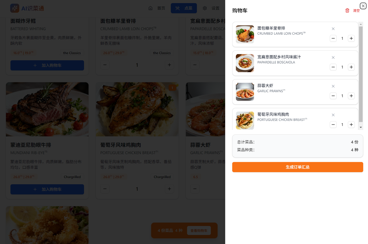 | 点餐页面 | 菜品列表 | 展示AI识别的菜品信息,包含中文名称、原文名称、描述和AI生成图片 |
