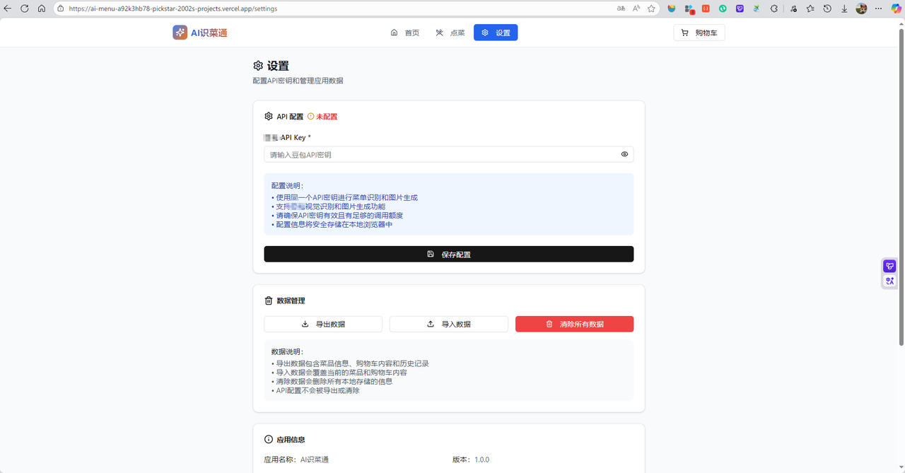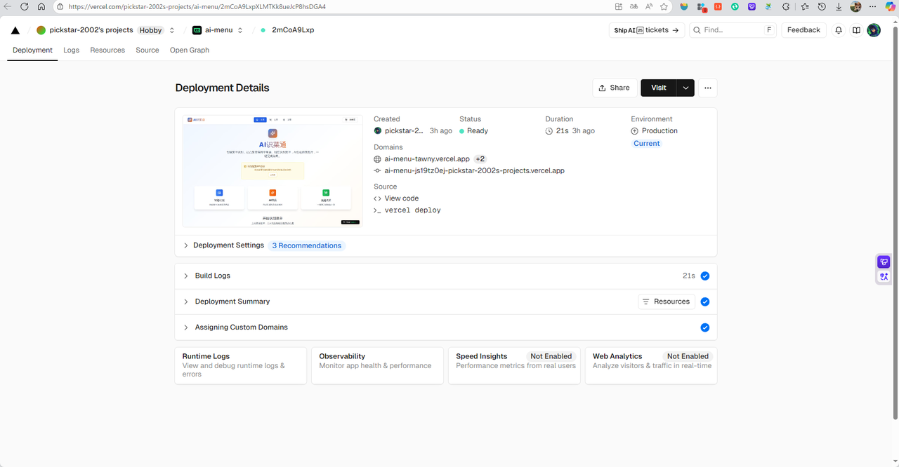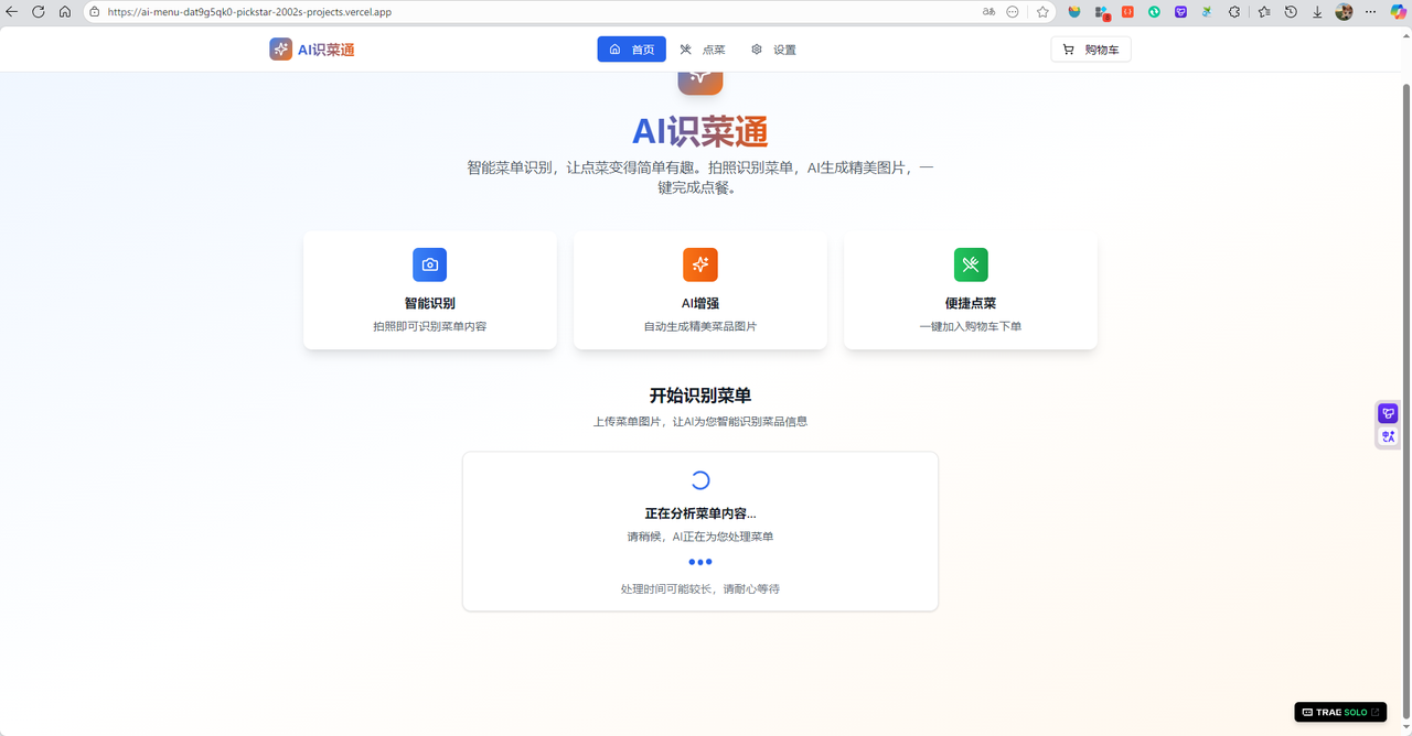 成果展示 1. 部署阶段 在项目“AI识菜通”的最终部署阶段,我选择了 Vercel 作为前端应用的托管平台。Vercel 以其卓越的开发者体验和对现代前端框架的深度支持,极大简化了部署流程。本项目基于 React 构建,并使用了 shadcn/ui 和 Radix UI 组件库,Vercel 能自动识别项目结构,实现一键部署和持续集成。每次代码推送至 GitHub 仓库,Vercel 都会自动构建并生成预览链接,方便快速测试与迭代。更重要的是,Vercel 提供全球边缘网络分发,确保用户无论身处何地,都能快速加载应用页面。整个“AI识菜通”从前端交互、图片上传,到调用豆包大模型进行多语言菜单识别与菜品图像生成,最终生成点餐字符串,全部通过 Vercel 高效、稳定地交付给用户。借助 Vercel 的免费计划和无缝 DevOps 能力,我得以将精力聚焦在核心 AI 功能开发上,而无需担心服务器运维,真正实现了“开发即部署”的现代 Web 开发体验。