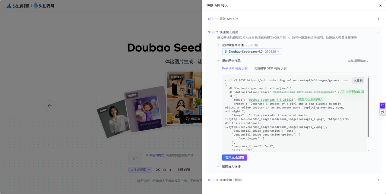 豆包大模型接入指南 本项目所用的视觉理解大模型和文生图大模型均采用火山引擎Mass平台,分别是doubao-seed-1-6-vision-250815和doubao-seedream-4-0-250828