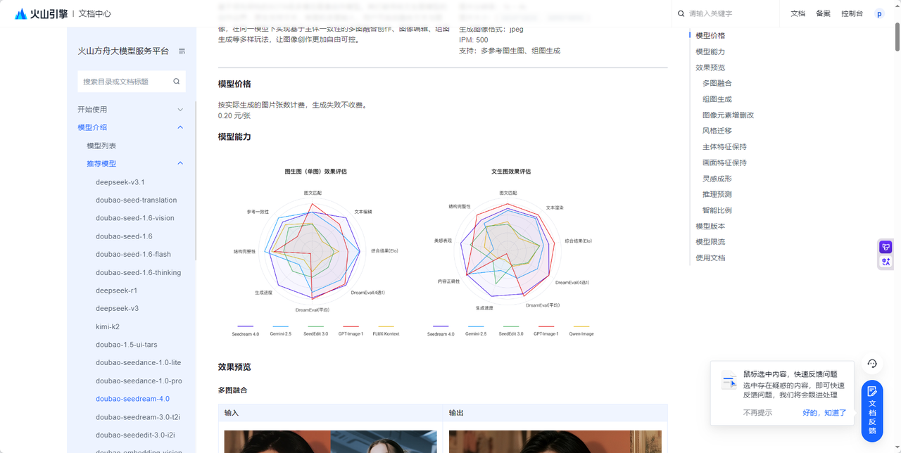 doubao-seedream-4.0 doubao-seedream-4.0基于领先架构的SOTA级多模态图像创作模型。其打破传统文生图模型的创作边界,原生支持文本、单图和多图输入,用户可自由融合文本与图像,在同一模型下实现基于主体一致性的多图融合创作、图像编辑、组图生成等多样玩法,让图像创作更加自由可控。