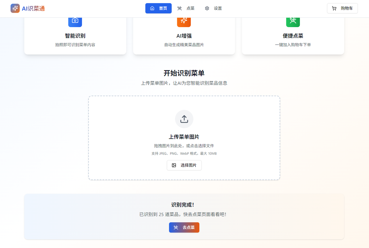 | 首页 | 菜单上传区域 | 支持拖拽或点击上传菜单图片,显示上传进度和预览 |