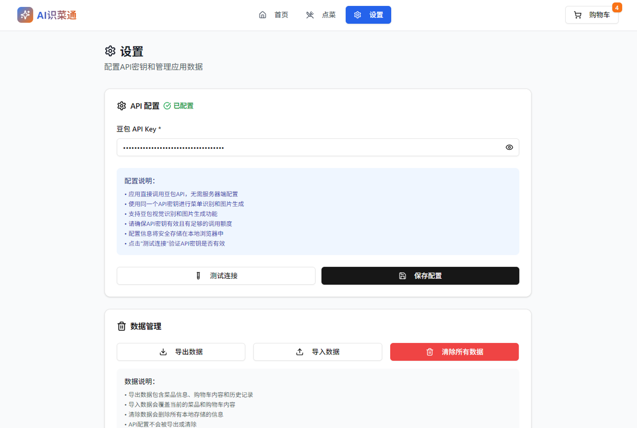 Plain Bash C++ C# CSS Diff HTML/XML Java Javascript Markdown PHP Python Ruby SQL 我要做一个AI识菜通应用。功能是:用户可以上传一张任何语言菜单图片,调用视觉理解模型doubao-seed-1-6-vision-250815,分析菜单中的内容并翻译为中文,之后进入第二个页面:点菜页面,点菜页面会将AI翻译后的中文菜单一一展示,并且用户可以点菜。每一道菜都包含它的名字、它的介绍和一张图片,图片调用doubao-seedream-4-0-250828模型的生成图片,然后用户点加号可以把这道菜加入他的购物车,最后点提交生成一个一串字符,上面写他想要点哪些菜,方便他跟服务员说他要点哪些。这个字符应该包合中文名和他元语言的名字。项目需要使用react 实现,使用 shadcn、redix 组件库。AI模型的API KEY放在local storage,通过网页右上角的齿轮按钮输入。
