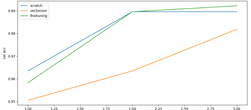 由于数据集较小,且模型相对简单。我们仅需进行少量训练( 3 个 epochs),便能取得非常好的结果(验证集准确率高达 90% 以上)。在以上三种情况下,网络都取得了优异的准确率,准确预测了 1,111 条非垃圾邮件和 169 个垃圾邮件。 下图显示了三种情况下模型训练过程中验证准确率变化的差异: