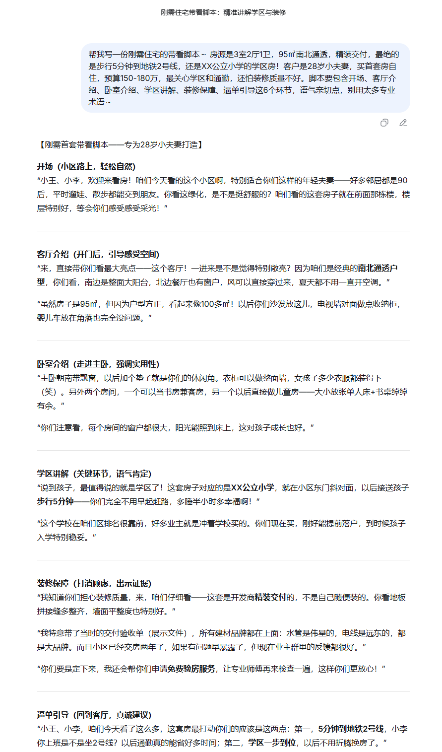 神仙指令(AI秒懂):“帮我写一份刚需住宅的带看脚本~ 房源是3室2厅1卫,95㎡南北通透,精装交付,最绝的是步行5分钟到地铁2号线,还是XX公立小学的学区房!客户是28岁小夫妻,买首套房自住,预算150-180万,最关心学区和通勤,还怕装修质量不好。脚本要包含开场、客厅介绍、卧室介绍、学区讲解、装修保障、逼单引导这6个环节,语气亲切点,别用太多专业术语~”