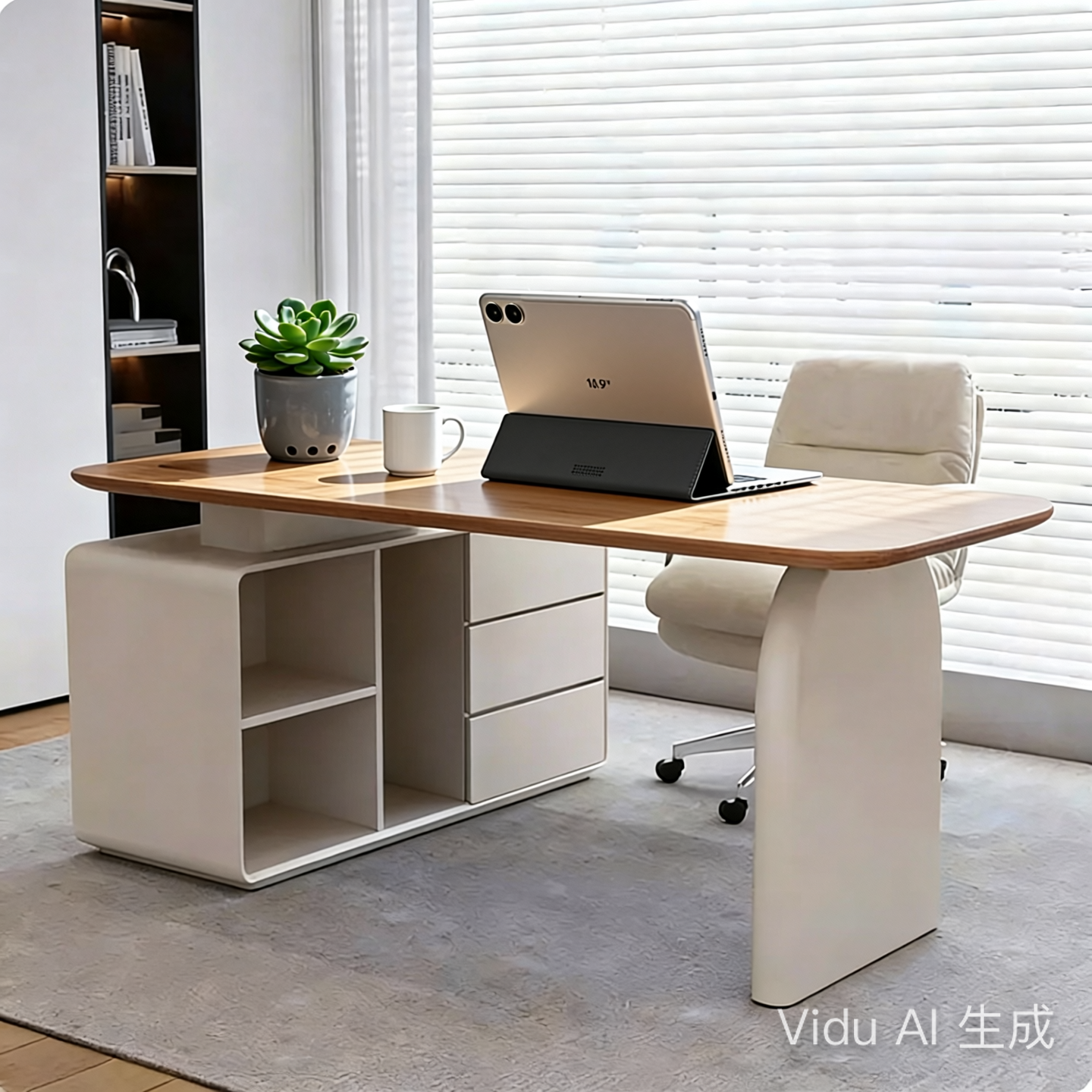 Vidu表现: Vidu Q2 并没有简单堆砌,而是智能调整了每个物体的透视角度。最惊艳的是光影互动,电脑、马克杯、绿植的阴影方向与窗外光线一致。