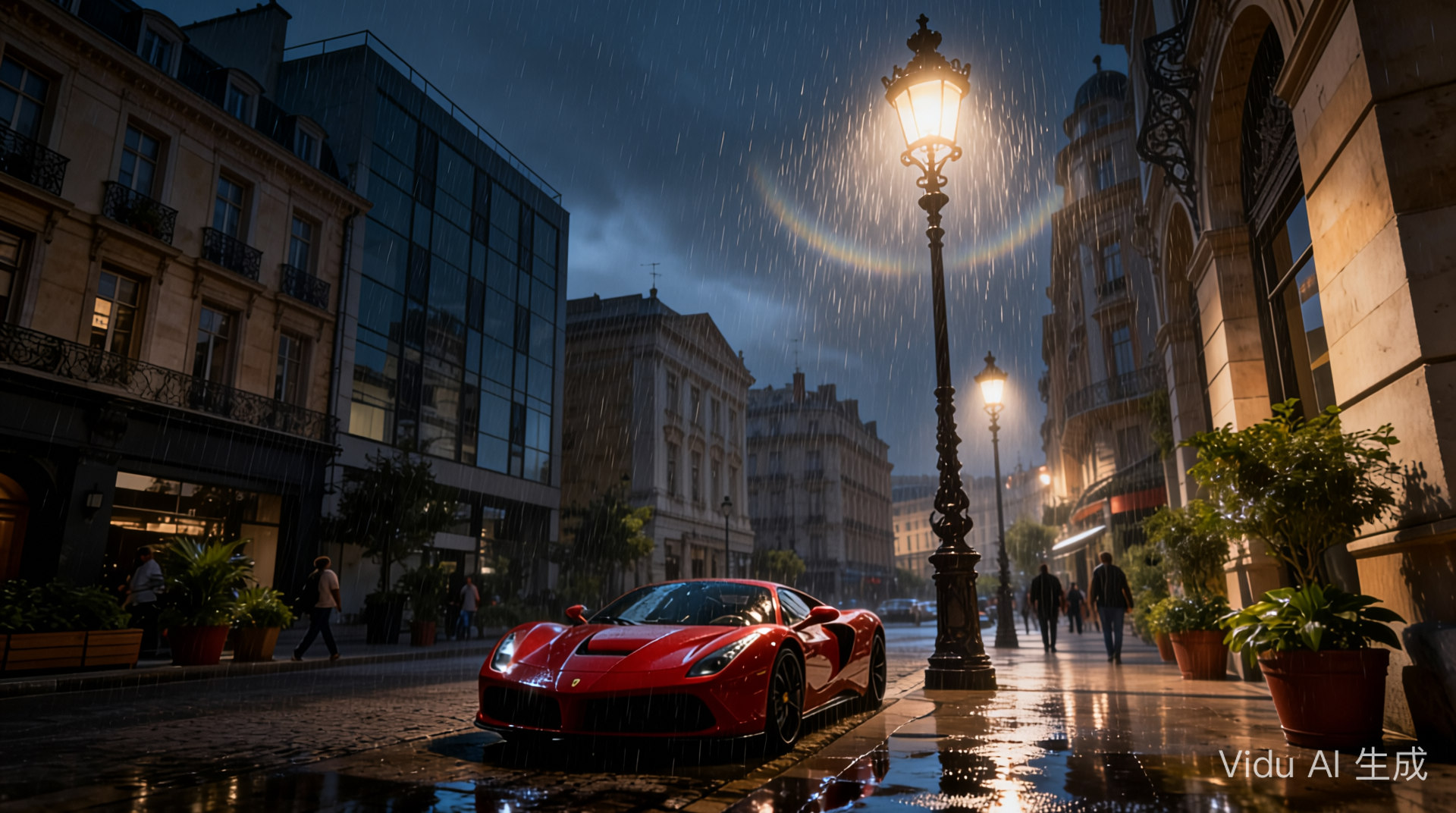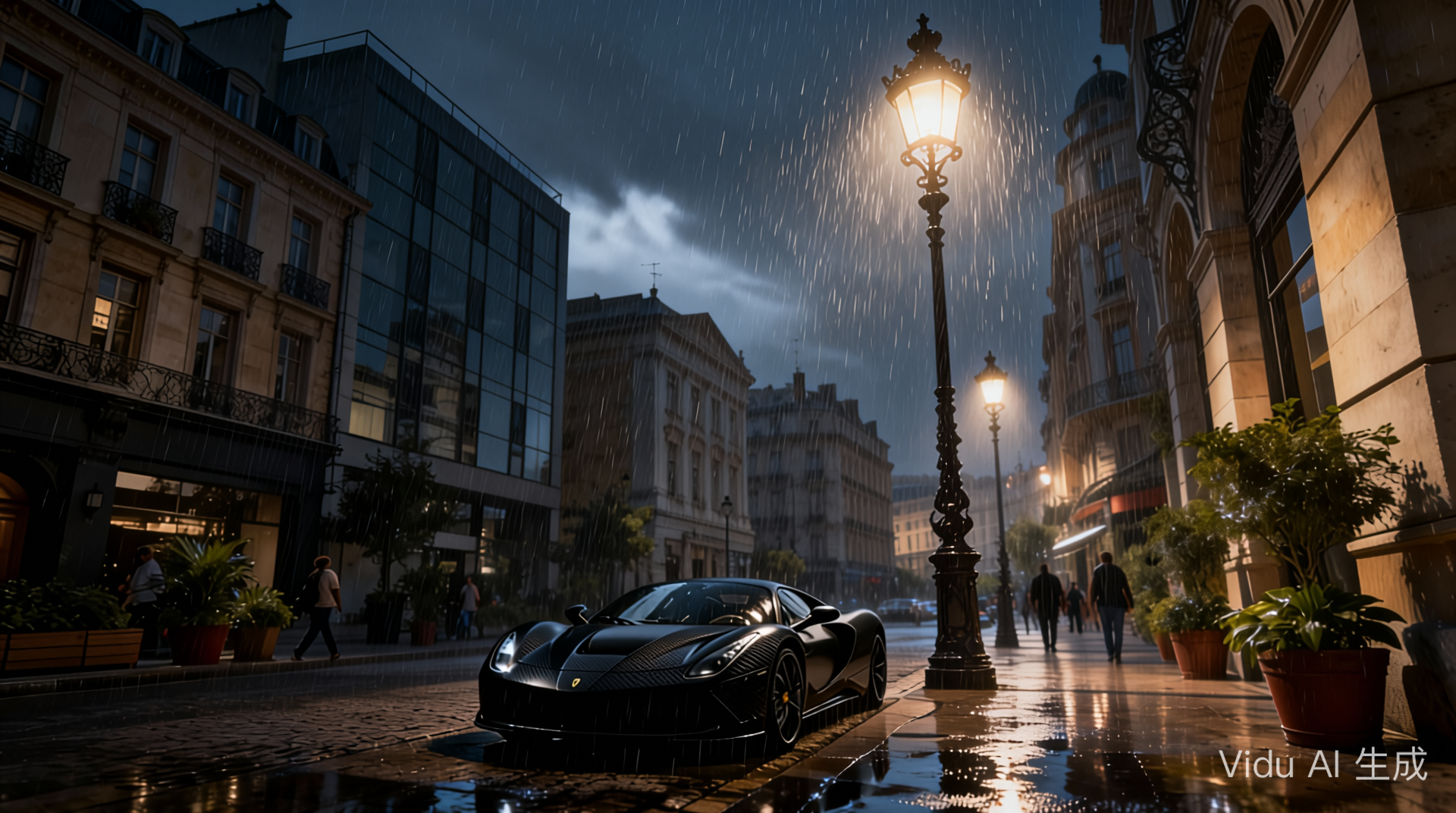 2.输入指令:“将图1中的晴天街景转换为夜晚下雨的氛围”,天空中下着小雨,地面出现了积水反射,路灯增加了雾气光晕。