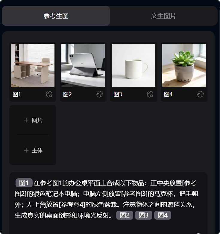 1. 上传《空办公桌》作为空间参考,开启“多主体参考”上传三个物品素材。