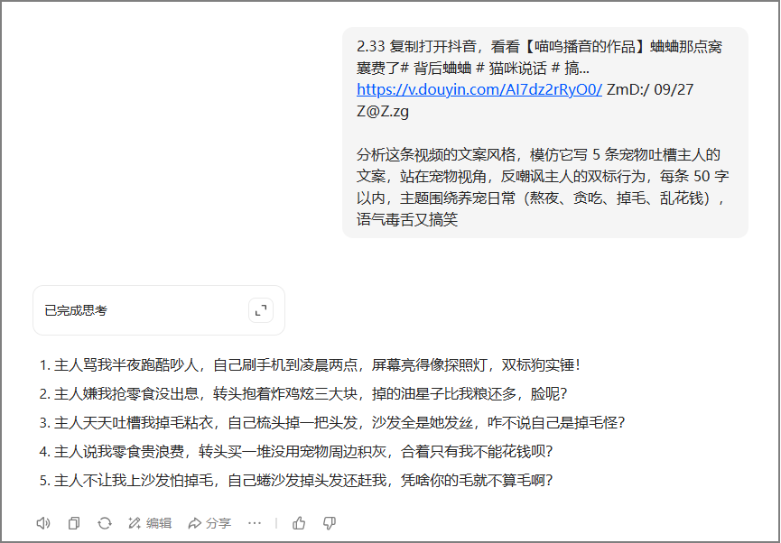 “分析这条视频的文案风格,模仿它写 5 条宠物吐槽主人的文案,站在宠物视角,反嘲讽主人的双标行为,每条 50 字以内,主题围绕养宠日常(熬夜、贪吃、掉毛、乱花钱),语气毒舌又搞笑”;