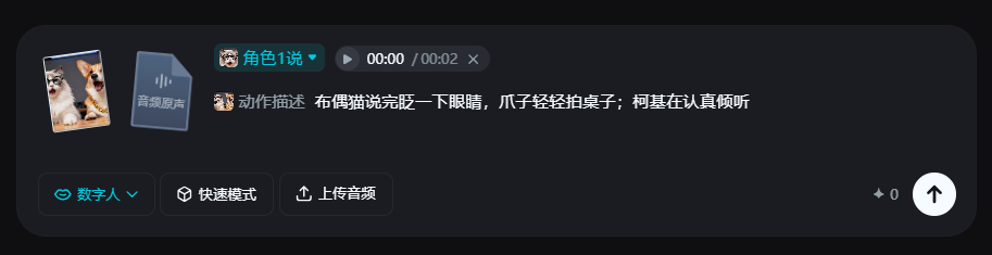 ③ 对口型生成说话效果:点击画面下方的 “数字人” 功能,上传图片,把第一步的文案按角色分配,同时可以加动作描述:比如: