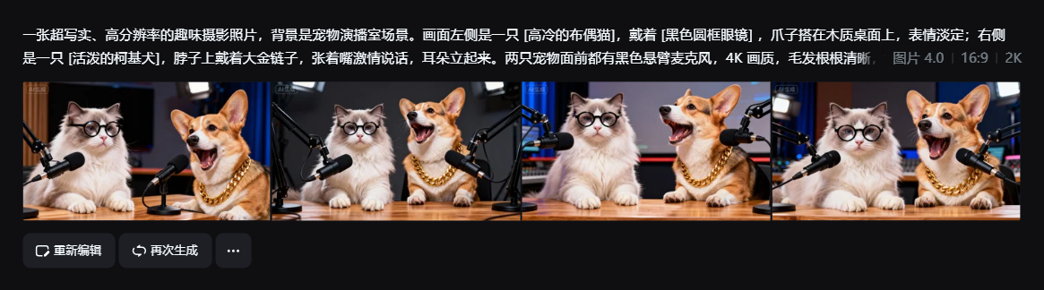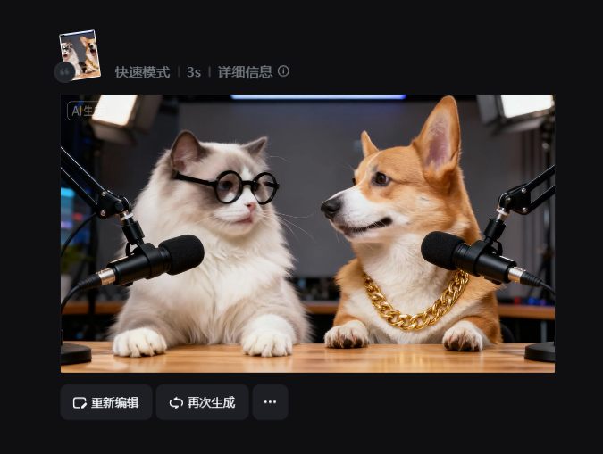 ② 生成画面:点击 “生成”,等待 30 秒,就能得到高清演播室画面,不满意就调整细节(比如 “布偶猫表情更冷漠”“柯基嘴巴张得更大”)