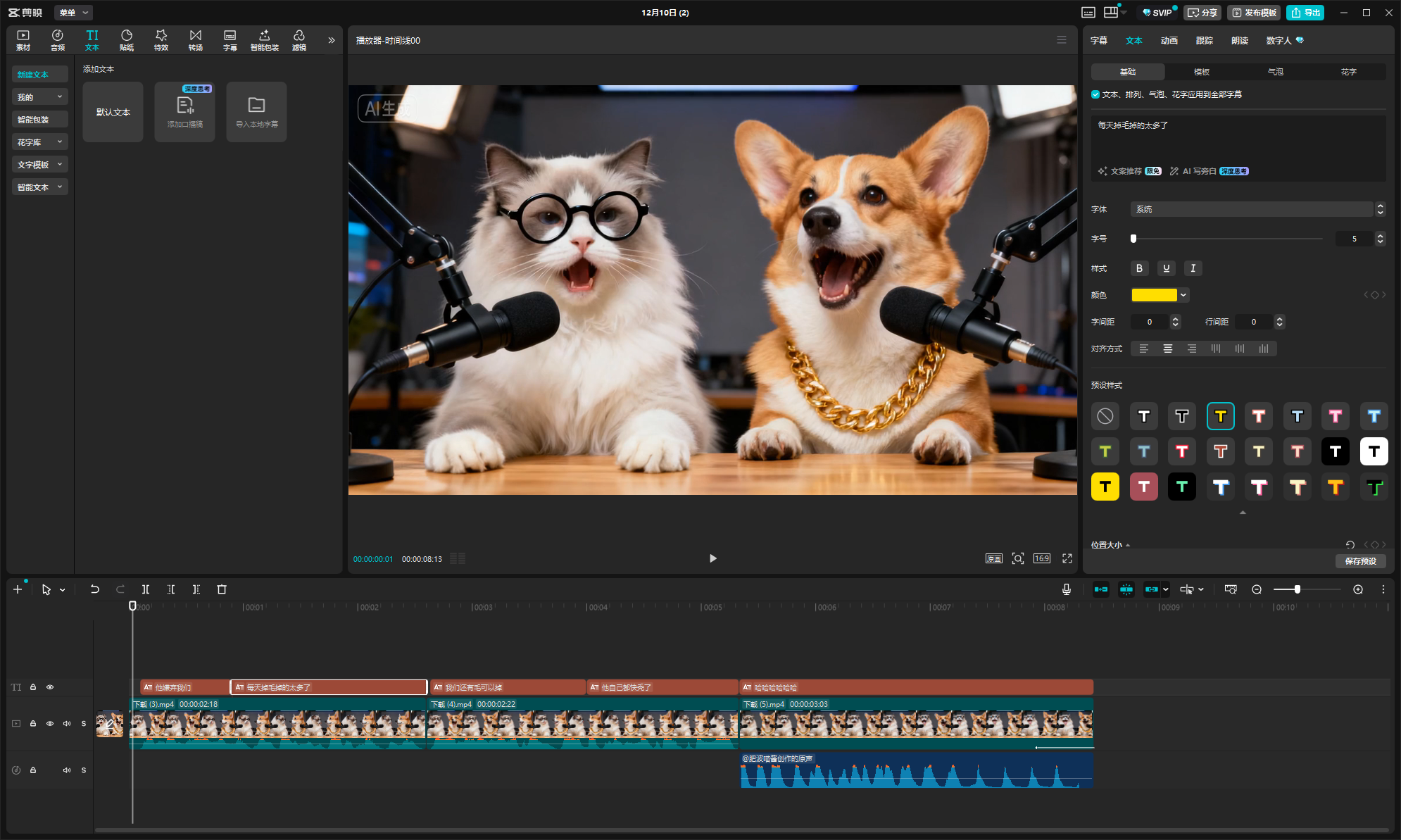 ③ 自动生成字幕:点击 “文本”→“智能字幕”,自动识别音频生成字幕,然后调整: