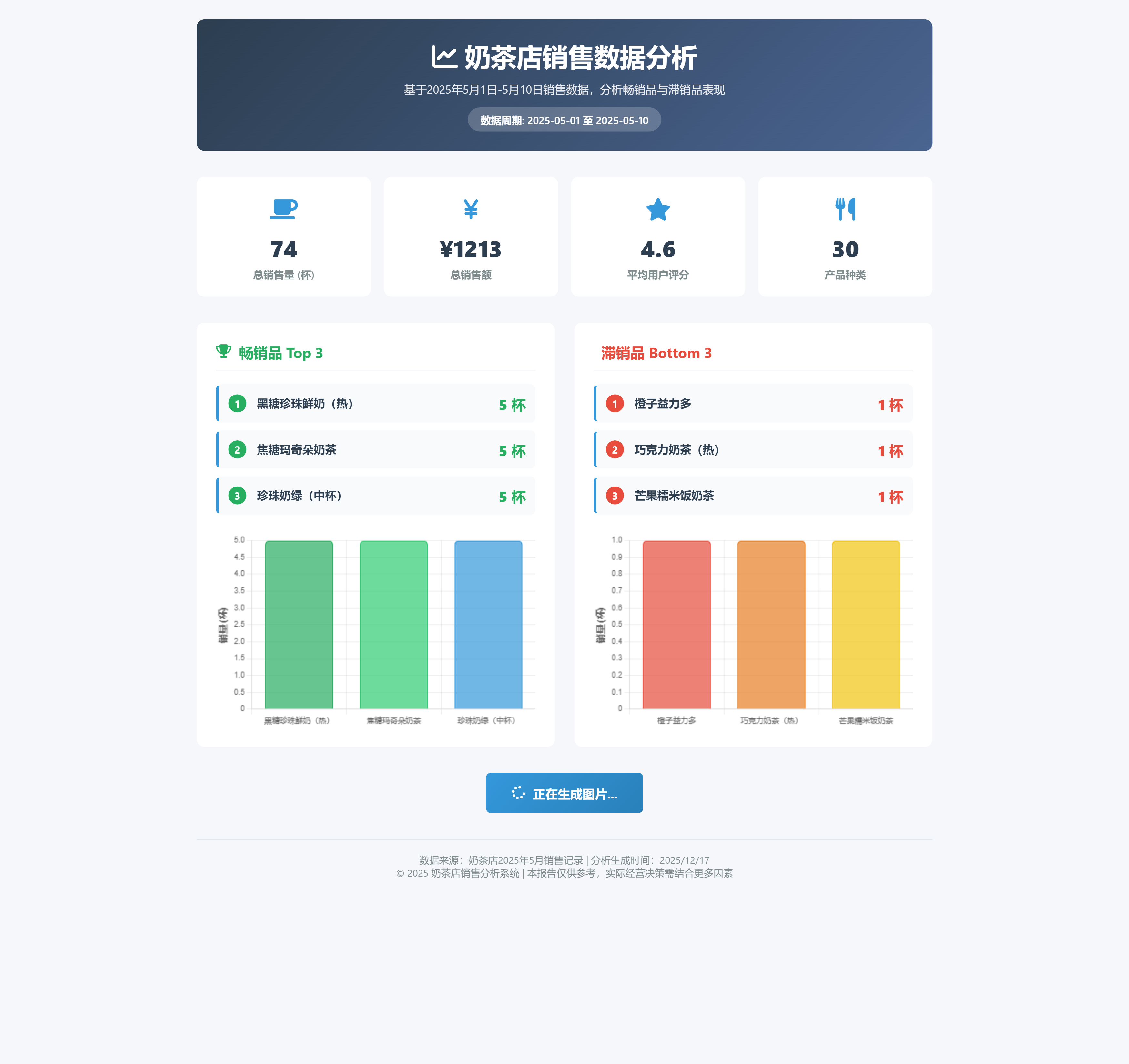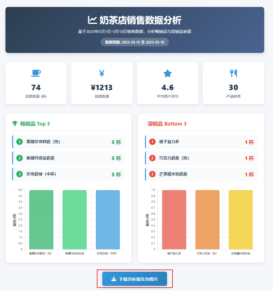 将 Excel 中的销售数据转为商务风卡片,用柱状图对比畅销品(Top3)和滞销品(Bottom3),标注具体销量,可下载为图片