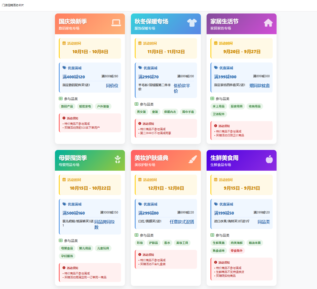 将以上促销内容生成活泼风格的 HTML 卡片,突出活动时间和满减规则,分区块展示参与品类,方便门店打印张贴