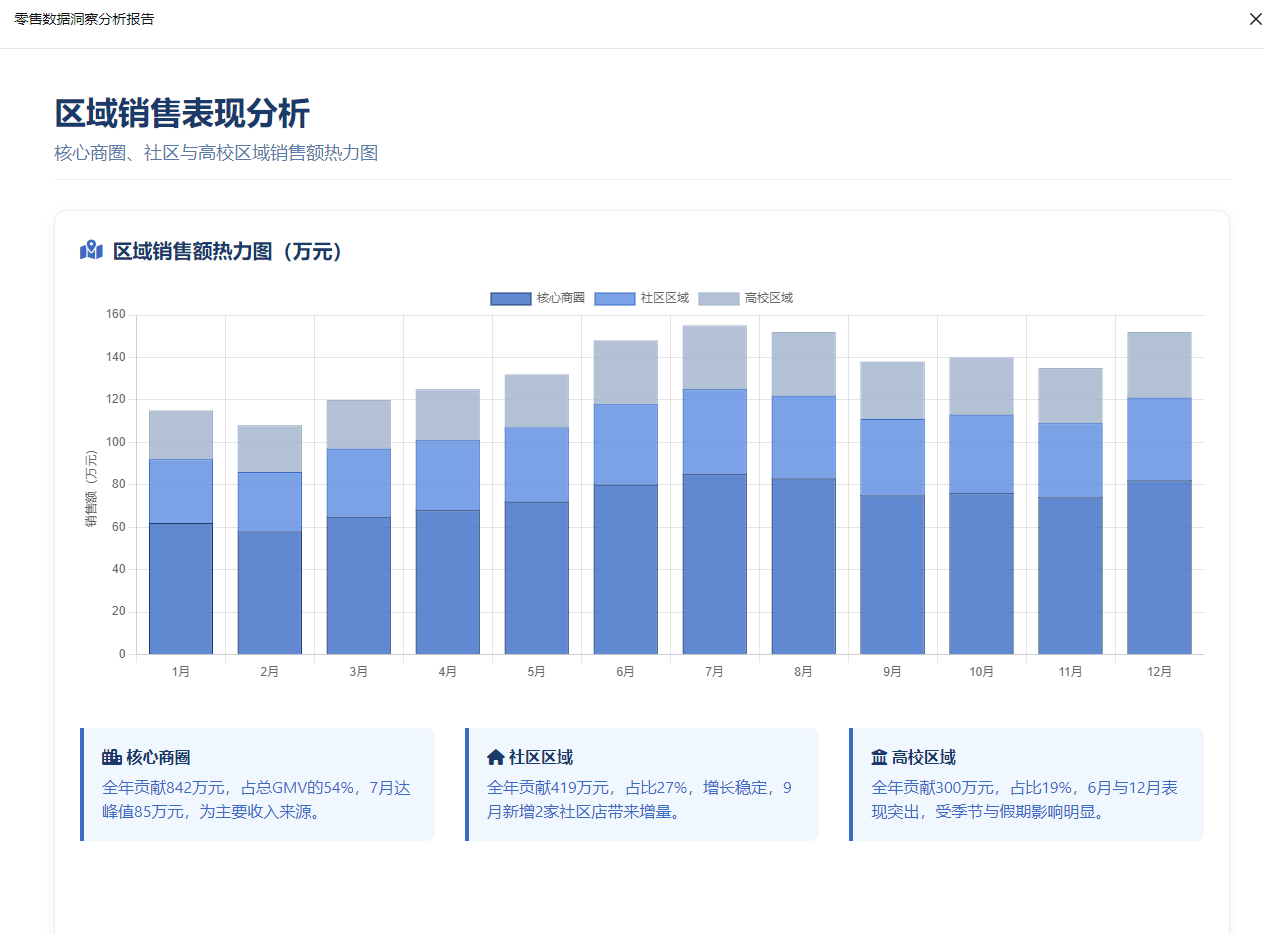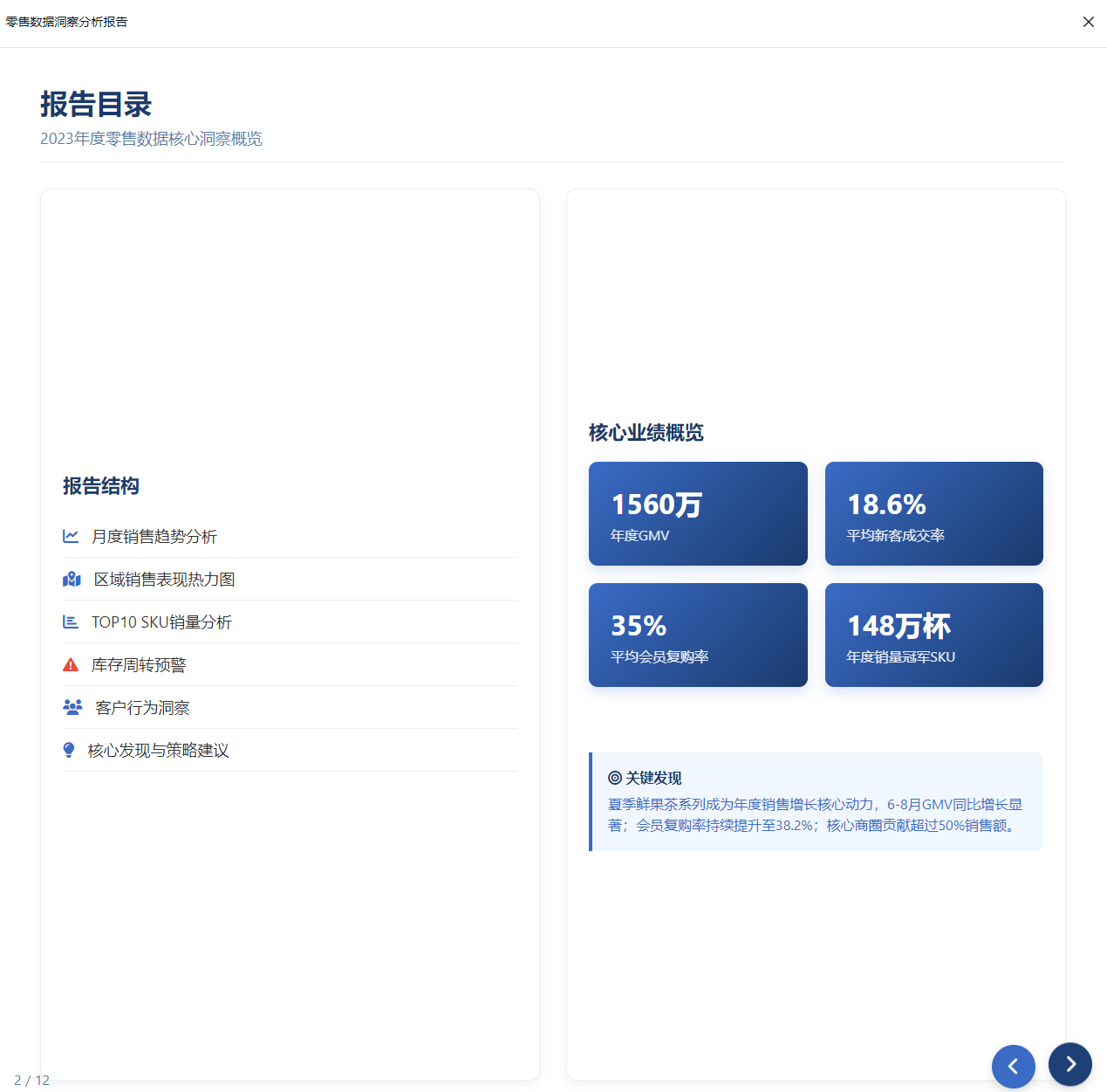 零售人高频需处理 “销售数据、库存数据、品类表现”,手动制作图表耗时且易出错,AI 可自动识别数据逻辑,生成专业可视化报告。