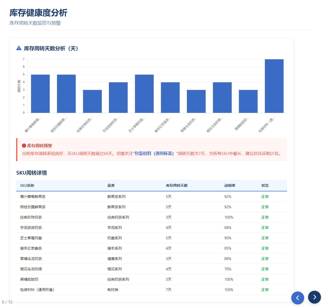 - 产品数据:SKU 销量排名、品类动销率、库存周转天数。