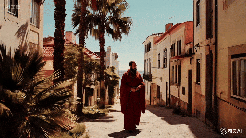 成片核心亮点:步辇图红衣使者+三亚现代街景,冷暖色调碰撞出孤独感;主观跟拍视角+微表情细节,AI合成却自带电影感;可灵自动音效匹配脚步声+交谈声,氛围感拉满。