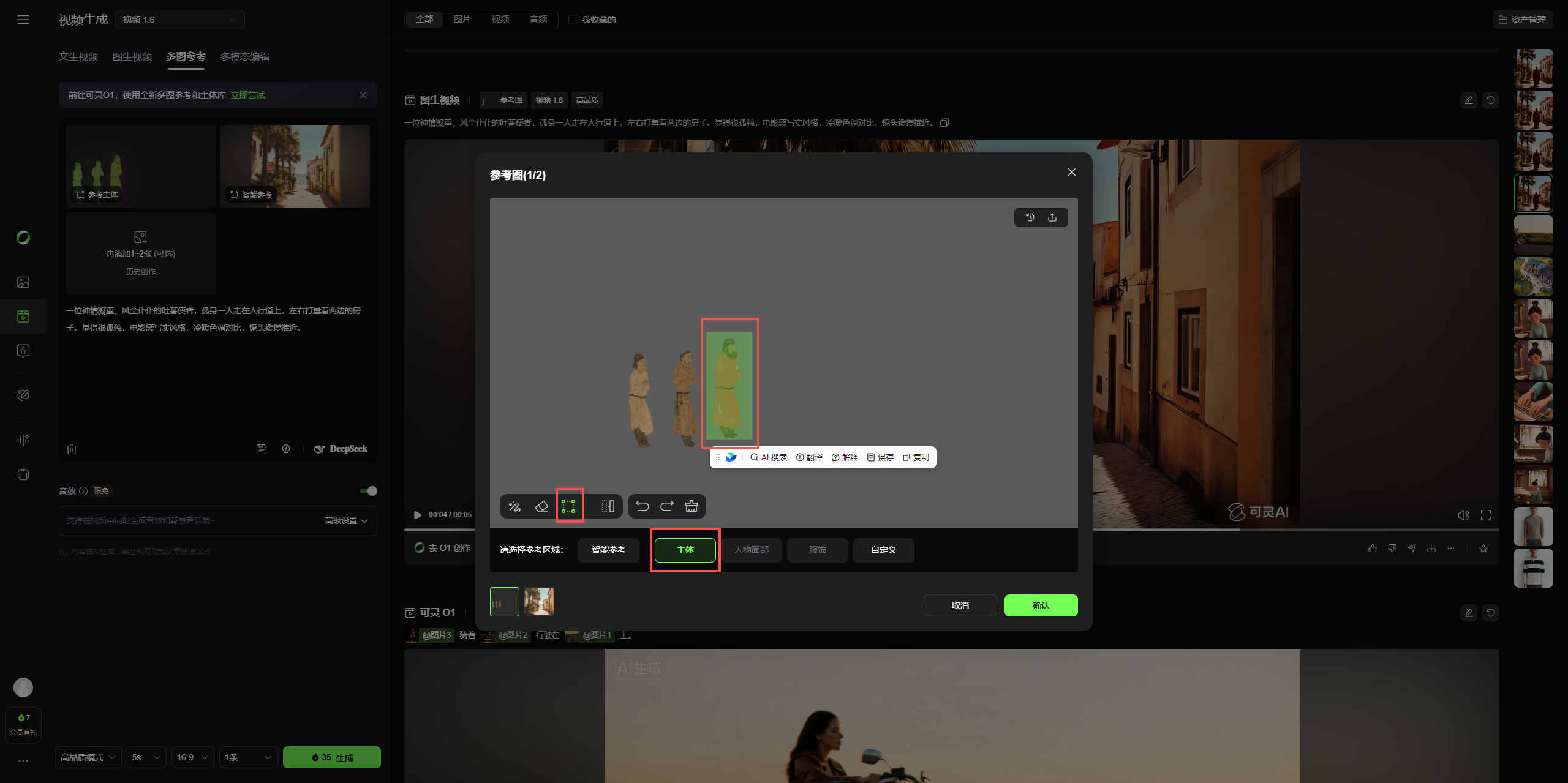 上传后在可灵画布中,点击图片的“参考主体”,进入选框后点击“主体”,选择「矩形框选工具」精准框选红衣使者全身;这里需要注意,因为我上传的图片人物图像太小了,所以 AI 识别不了人物的穿着和人物的面部表情,这里如果你能选就选,能保证出来的人物不会失真。