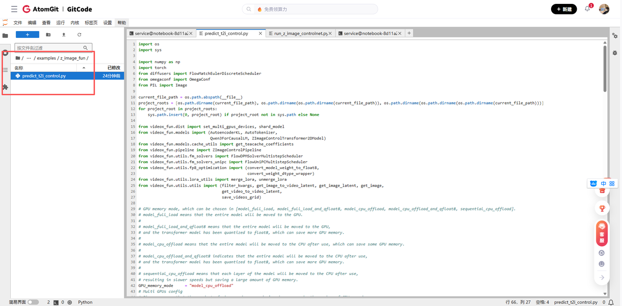 下载完成后,我们来看看如何运行这个模型。根据文档,运行文件是examples/z_image_fun/predict_t2i_control.py。让我们深入分析这个关键文件。