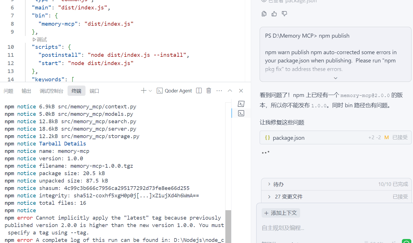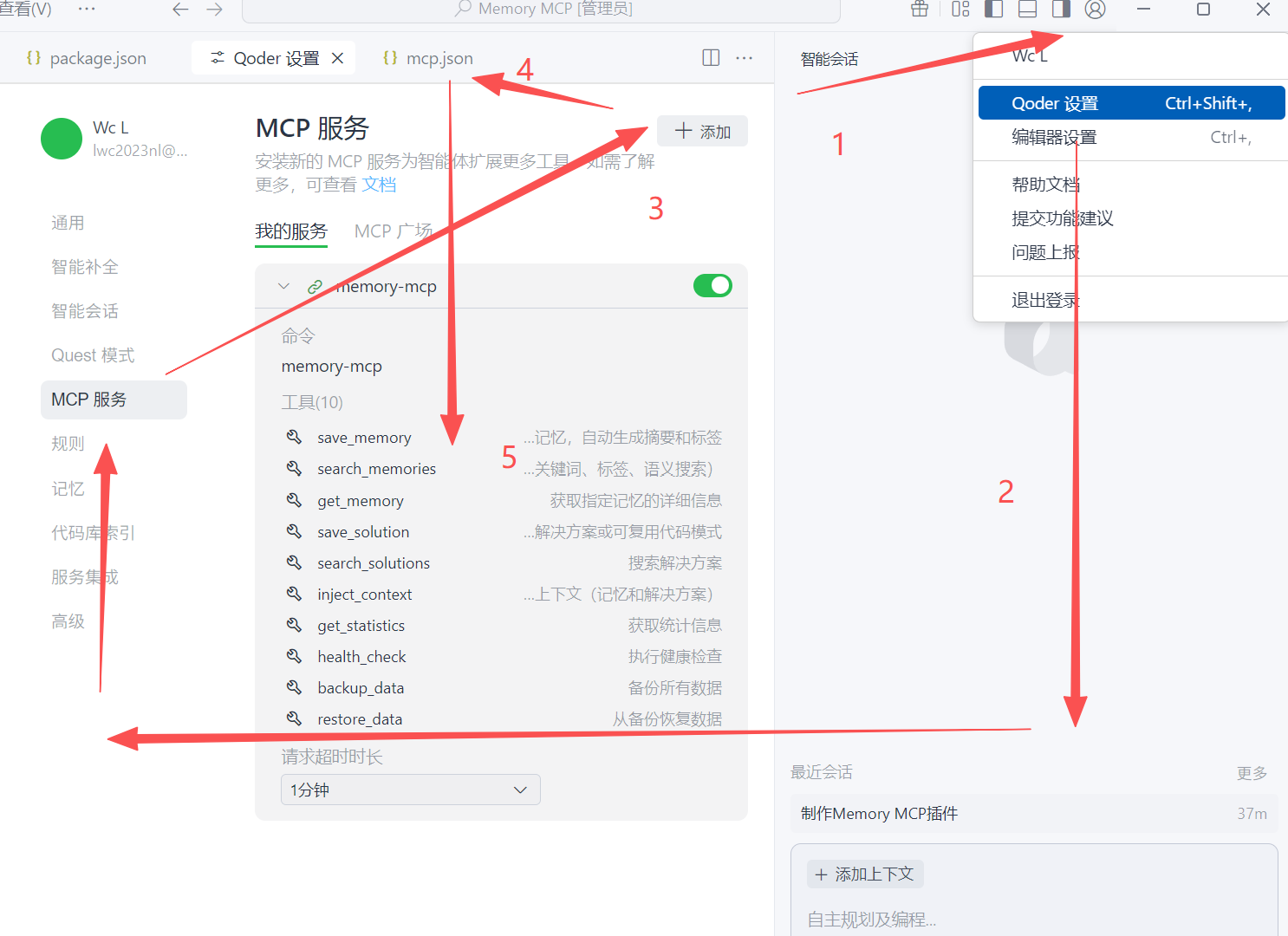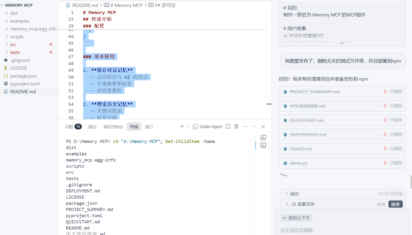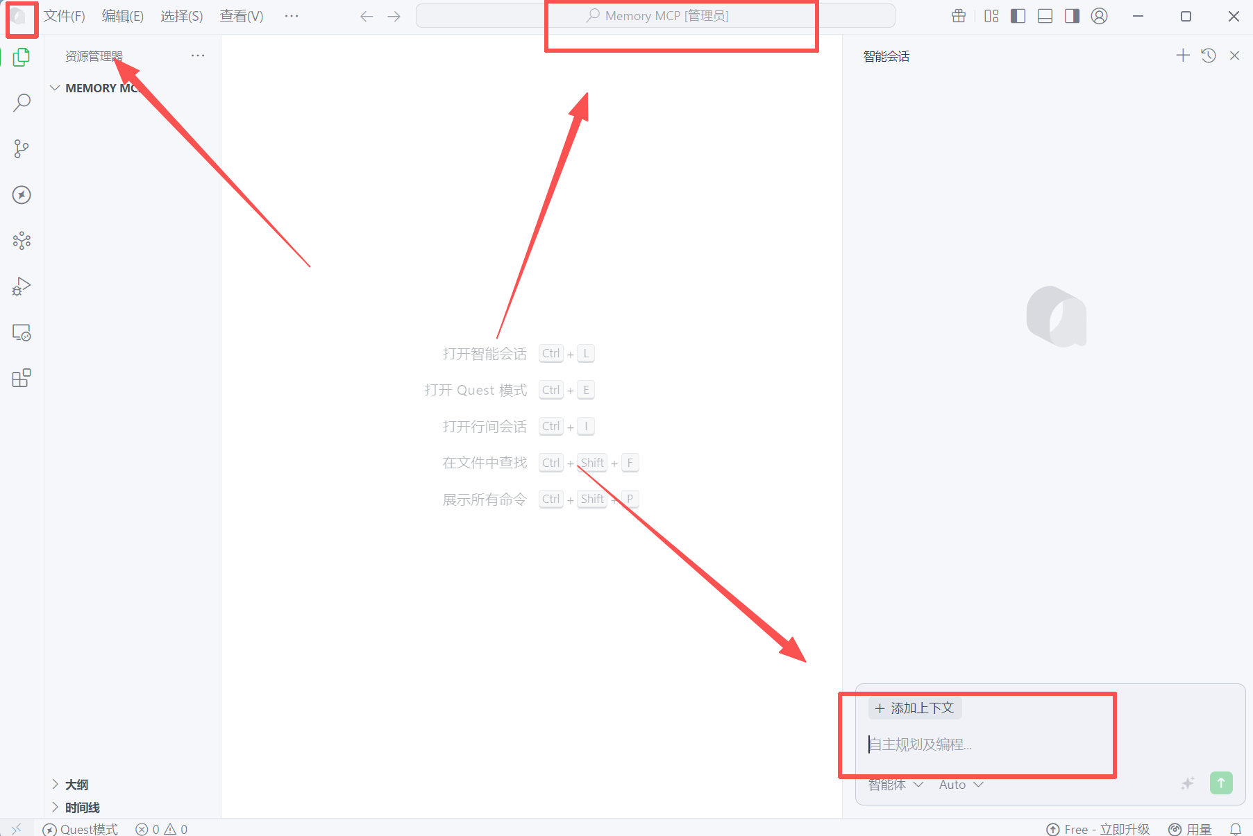 打开Qoder -> 打开指定的文件夹(如:Memory MCP) -> 启动AI对话框。(建议用管理员的身份运行)