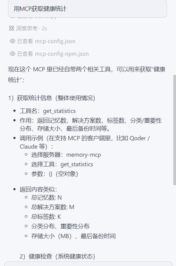 在AI对话中,输入,用MCP获取健康统计,可以看到AI注册的回复。