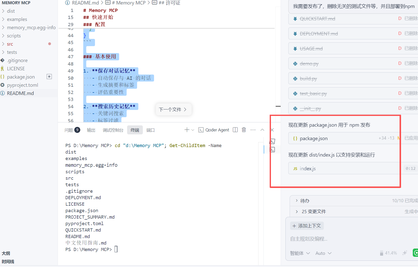 由于发布不需要测试,我们直接对AI说删除无关的测试文件等即可。直接对AI说:
