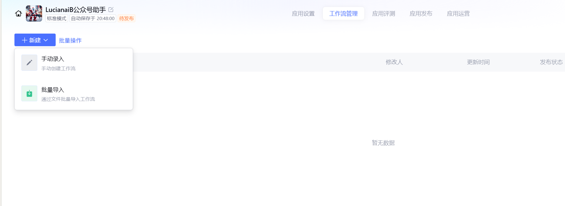 点击上方的工作流管理,点击新建,选择手动录入。