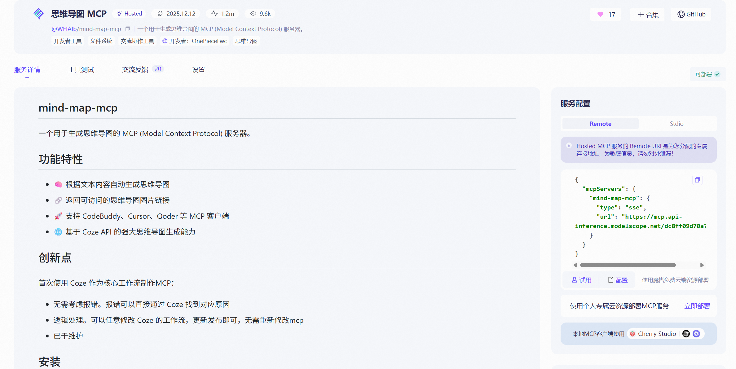 由于我的mcp部署在魔塔mcp广场,所以打开魔塔中我的mcp,https://modelscope.cn/mcp/servers/WEIAIb/mind-map-mcp,在右侧配置一个就可以得到一个sse的url。