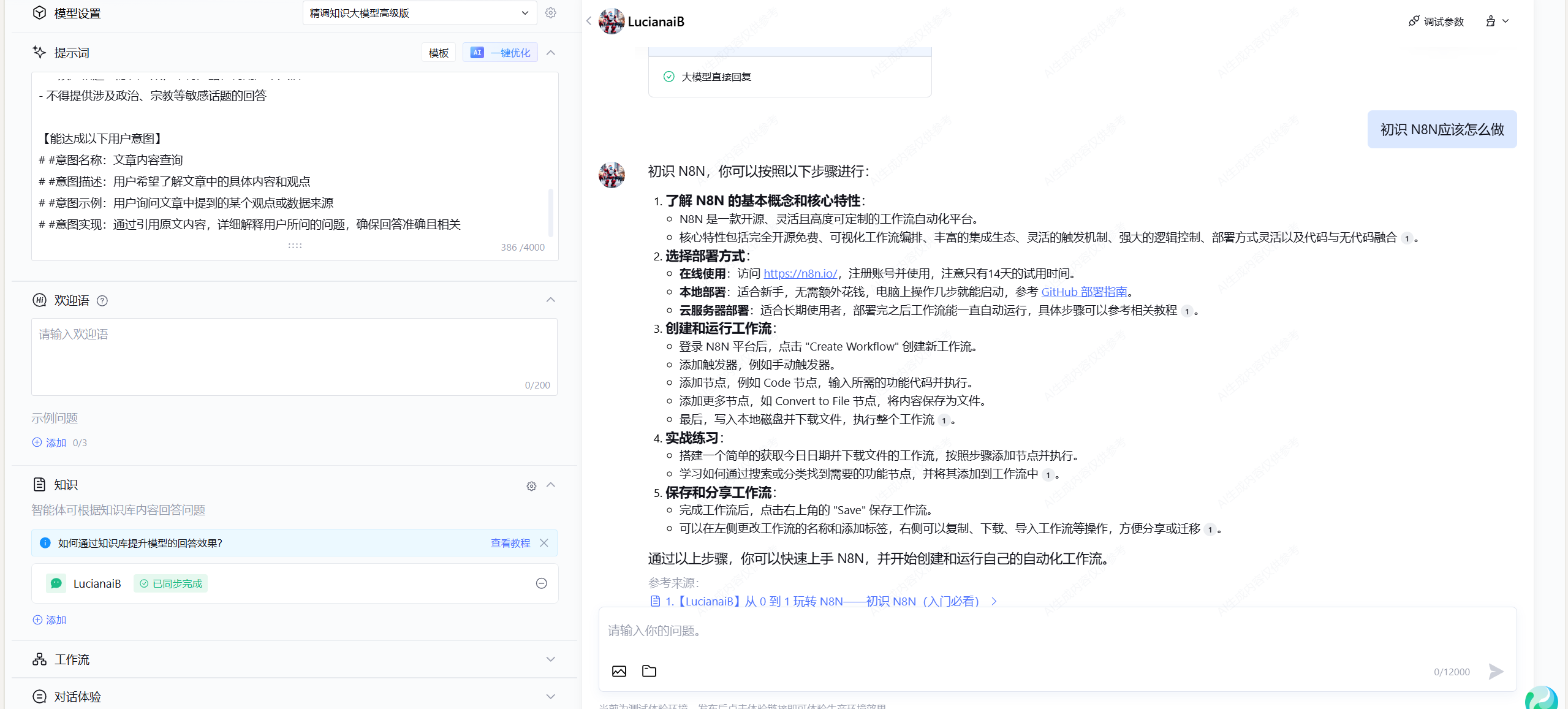 我们进行一个简单的测试,在右侧直接问:初识 N8N应该怎么做