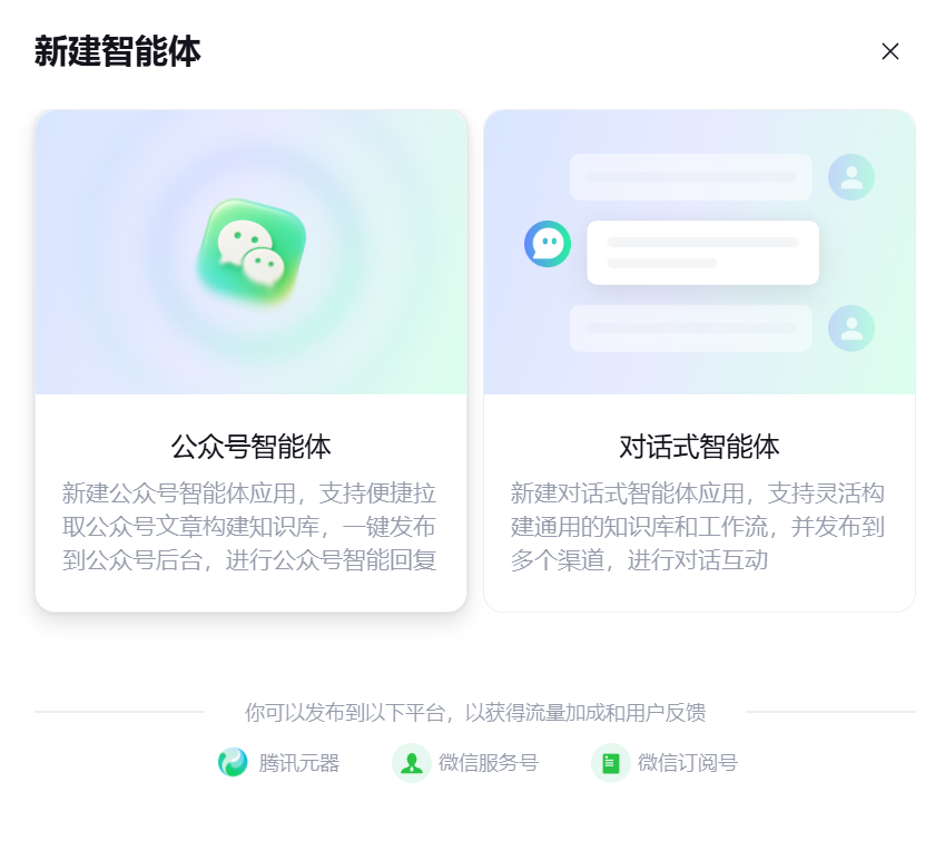 腾讯元器是面向开发者的AI智能体一站式创建与分发平台,深度打通腾讯生态,用户无需编程,通过可视化界面即可快速构建具备对话、内容生成、图像处理等能力的智能体,并一键发布到微信公众号、小程序、微信客服、应用宝商店等腾讯生态场景。