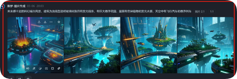 根据 DeepSeek 提供的创意方向,生成适合即梦 AI 的提示词。例如:“未来感十足的科幻城市风景,建筑为流线型透明玻璃材质且有发光线条,有巨大悬浮花园,里面有奇异植物和发光水源,天空中有飞行汽车和悬浮列车”。