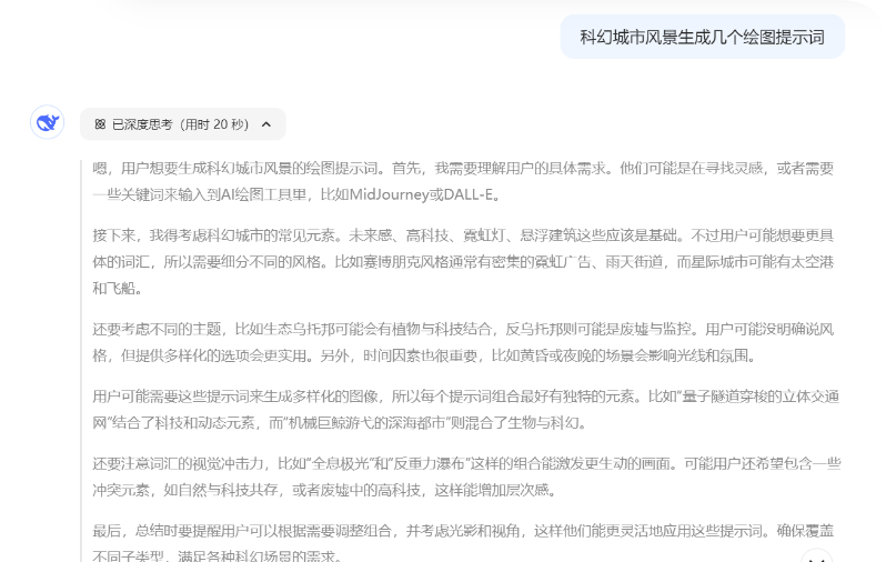 在 DeepSeek 的对话框中输入与主题相关的问题,例如:“请为科幻城市风景创作提供一些创意方向”。以下是一个与 DeepSeek 交互的示例代码