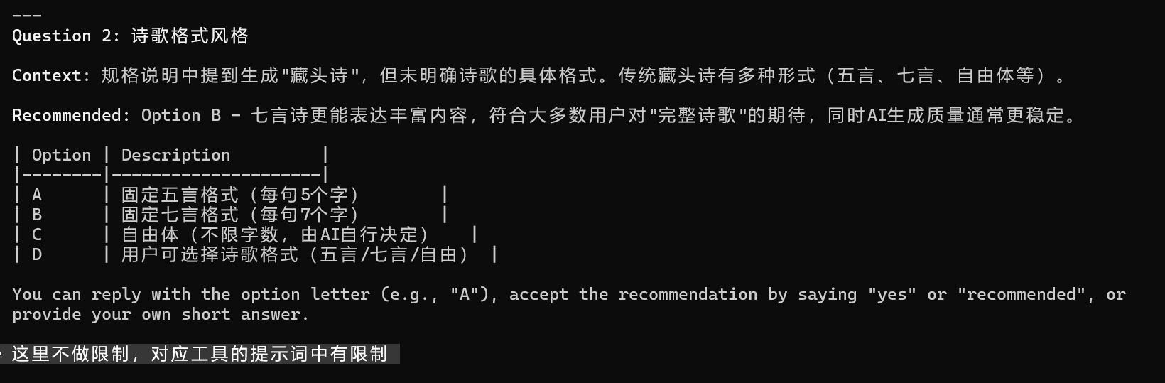 ## 作用:Spec-Kit 开始针对需求不明确的点,向我们提问.无需额外输入,直接执行即可
