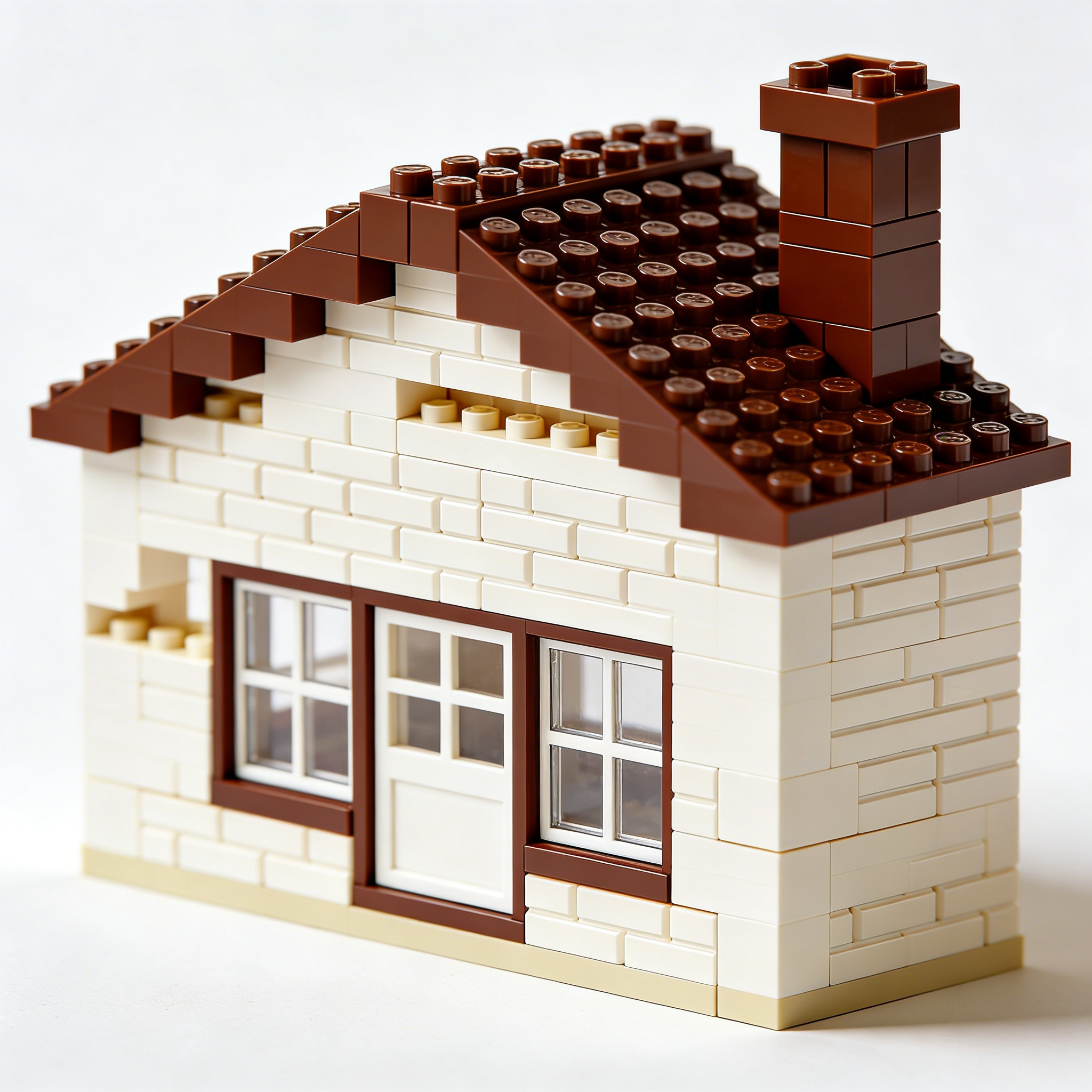 关键词:堆砌米白墙体,安装深棕色屋顶和烟囱,添加门窗细节