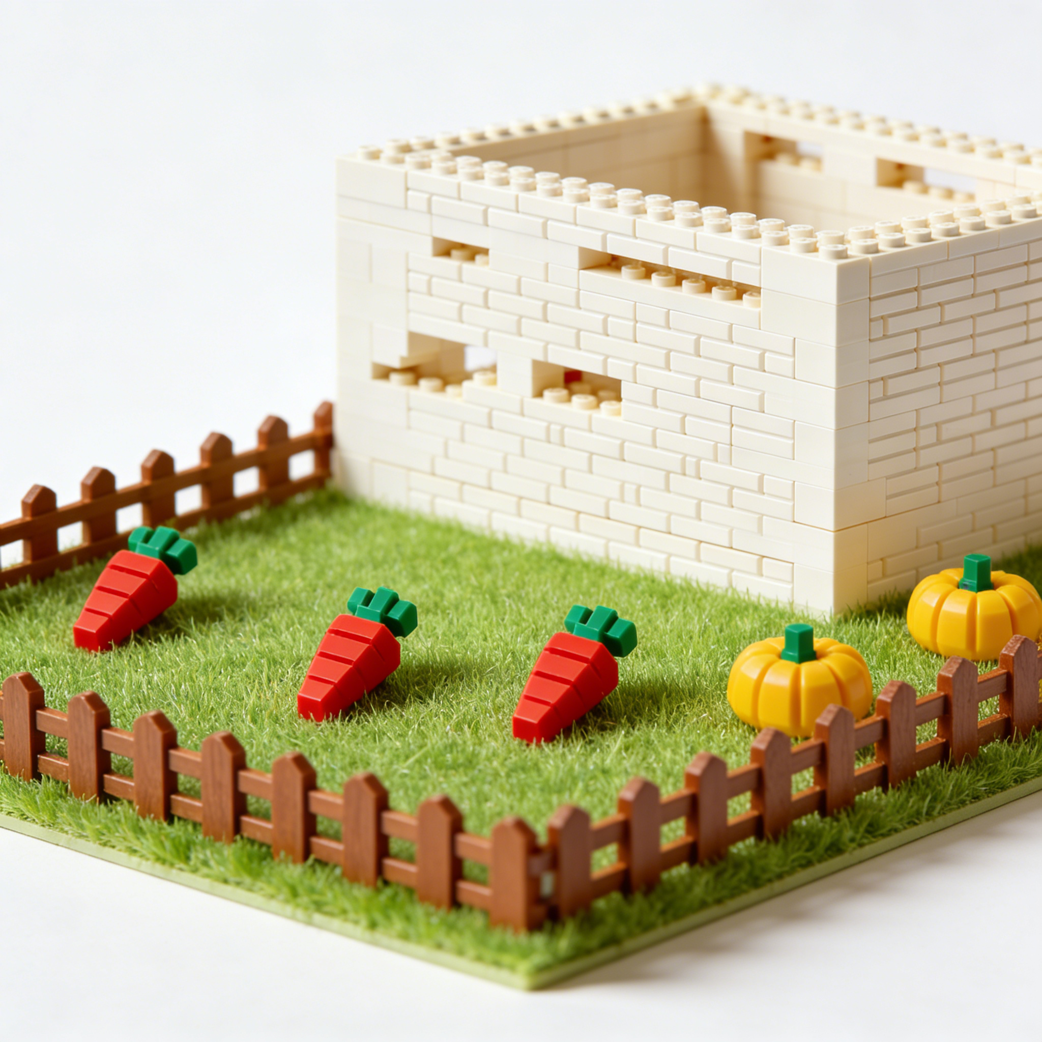 关键词:添加木栅栏、浅绿草坪、红黄蔬菜零件,完成场景布置