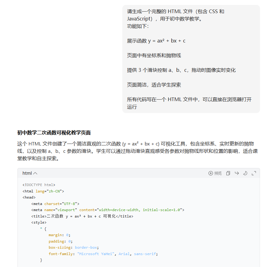 而借助 AI,即使完全不懂编程,也可以亲手做一个👉 能拖、能试、还能自己“动起来”的二次函数探索网页。