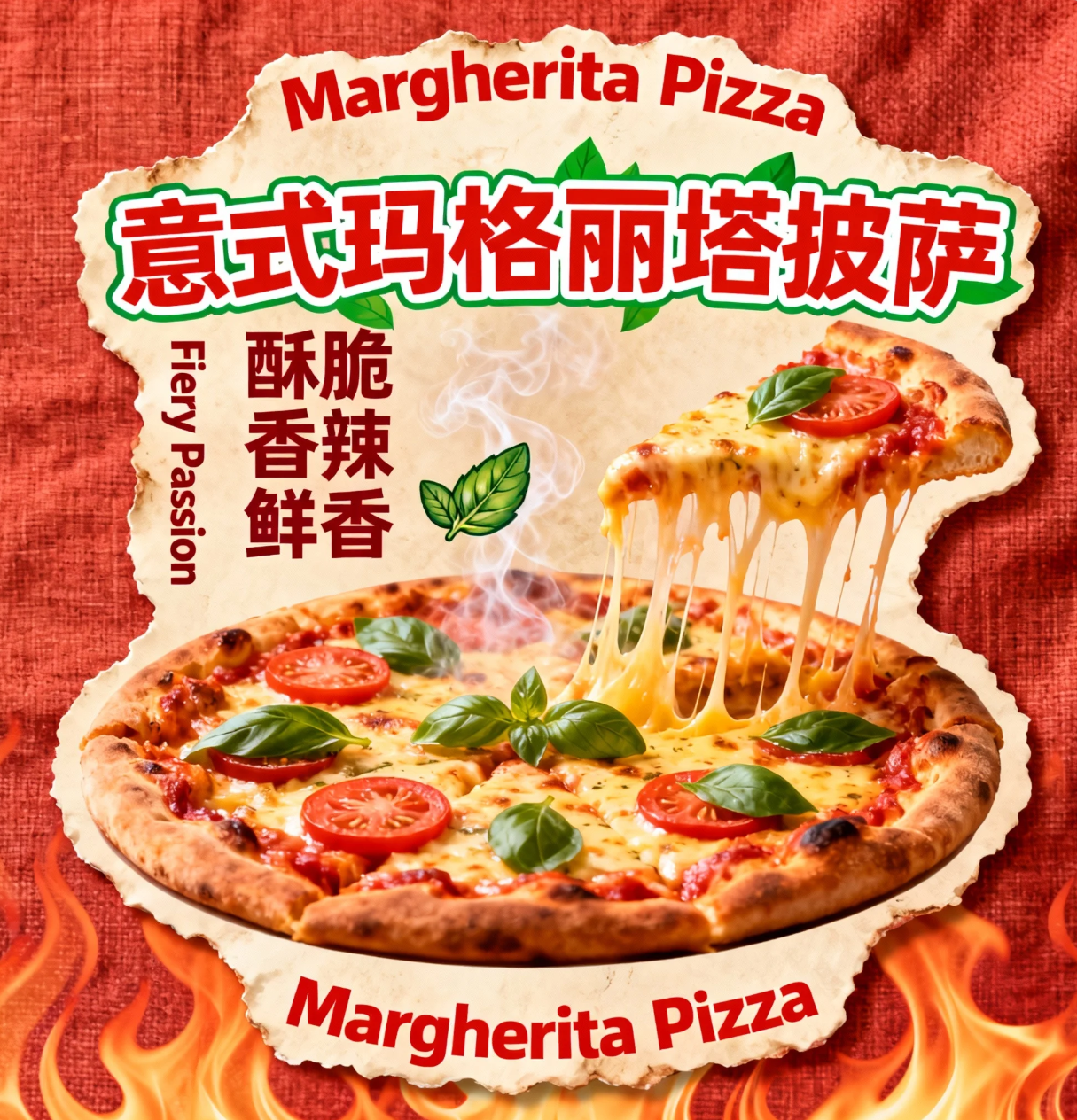 一个意式玛格丽塔披萨异形卡设计,背景是温暖的番茄红亚麻布,带点烤箱热浪纹理。腰封主体为不规则的、拉丝状的 “马苏里拉芝士” 异形,模拟芝士正从披萨上拉长的动态。核心展示一张热腾腾的玛格丽塔披萨,顶部新鲜罗勒叶和番茄片冒烟。文字部分:顶部和底部用辣椒红字体标 “Margherita Pizza”。中间主标题:“意式玛格丽塔披萨”,采用鲜红和绿叶色组合的活泼艺术字。左侧竖排:“Fiery Passion”。下方用深红字体标注 “酥脆 香辣 鲜香”,搭配罗勒叶图标。风格要求:热情、活力、街头美食感,商业摄影光感,突出披萨的焦香和芝士拉丝,色彩以番茄红、绿叶、芝士黄为主,营造意大利风情的西餐派对氛围。