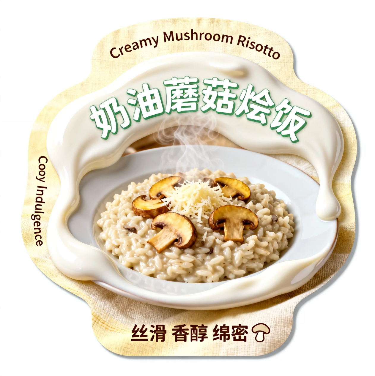 一个奶油蘑菇烩饭异形卡设计,背景是柔和的米黄色亚麻布,带点蒸汽纹理。腰封主体为圆润的、奶白色的 “奶油蘑菇酱” 异形,模拟酱汁缓缓包裹饭粒的动态。核心展示一盘热气腾腾的烩饭,点缀金黄蘑菇片和帕玛森奶酪屑。文字部分:顶部和底部用浅棕字体标 “Creamy Mushroom Risotto”。中间主标题:“奶油蘑菇烩饭”,采用奶油白和浅绿组合的柔和艺术字。左侧竖排:“Cozy Indulgence”。下方用深棕字体标注 “丝滑 香醇 绵密”,搭配蘑菇图标。风格要求:温馨、 家庭式高端,商业摄影光感,突出饭菜的绵软和奶油的诱人光滑,色彩以奶白、浅绿、米黄为主,营造舒适的西餐晚宴氛围。