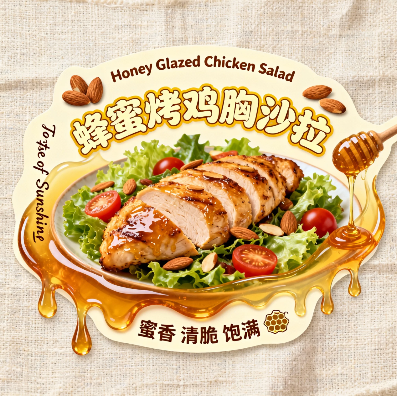 一个蜂蜜烤鸡胸沙拉异形腰封设计,浅米色亚麻布纹理的背景,腰封主体是流动的、晶莹剔透的蜂蜜琥珀色 “蜂蜜淋汁” 异形,模拟蜂蜜正从烤鸡上缓缓滴落的动态。核心展示一个金黄烤鸡胸沙拉,铺满新鲜生菜、樱桃番茄和烤杏仁,表面闪着蜂蜜光泽。文字部分:腰封顶部和底部用烤杏仁棕色字体标 “Honey Glazed Chicken Salad”。中间主标题:“蜂蜜烤鸡胸沙拉”,采用奶油黄色和蜂蜜色组合的圆润手写字体。左侧竖排:“Taste of Sunshine”。下方用深棕色字体标注 “蜜香 清脆 饱满”,搭配蜂巢图标。风格要求:温暖、天然、充满阳光感,商业摄影光感,突出食材的鲜嫩和蜂蜜的诱人光泽,色彩以琥珀色、坚果棕、奶油黄为主,营造健康、美味、充满活力的西餐视觉效果。