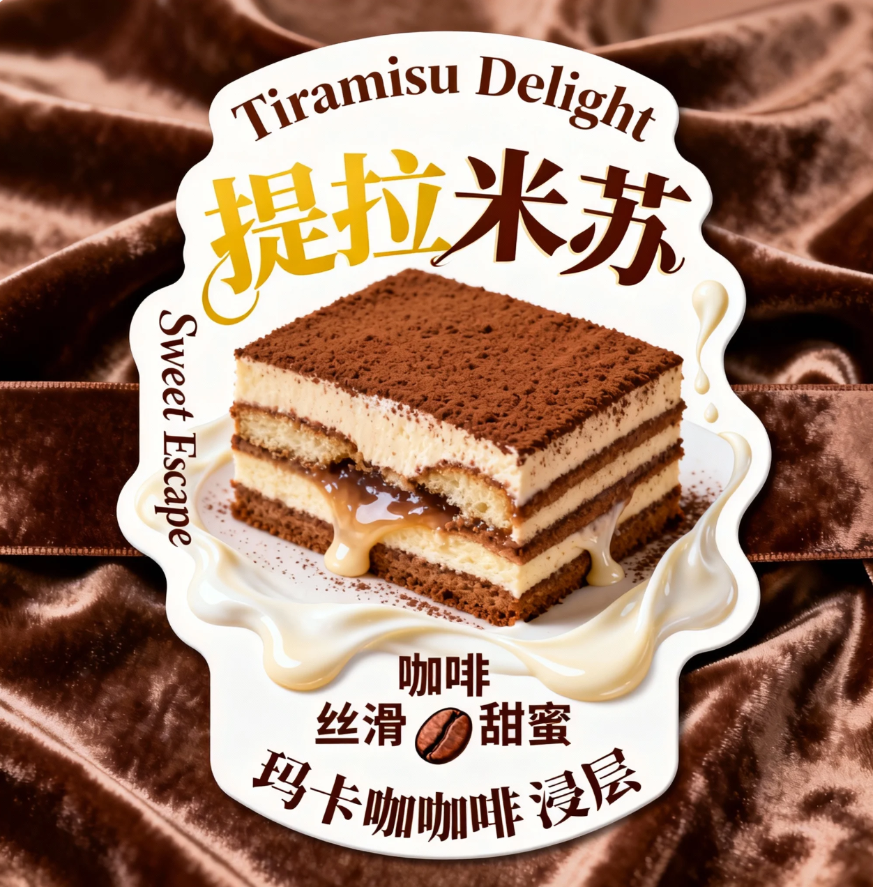 一个提拉米苏甜点异形卡设计,背景为优雅的咖啡色丝绒纹理。腰封主体是层层叠叠的、咖啡色的 “玛卡咖啡浸层” 异形,动态如奶油从层层中渗出。核心展示一个经典提拉米苏,表面撒满可可粉,切面露湿润蛋糕层。文字部分:顶部和底部用咖啡棕字体标 “Tiramisu Delight”。中间主标题:“提拉米苏”,采用金黄和咖啡色组合的浪漫手写字体。左侧竖排:“Sweet Escape”。下方用深棕字体标注 “咖啡 丝滑 甜蜜”,搭配咖啡豆图标。风格要求:浪漫、甜蜜、精致诱人,商业摄影光感,突出甜点的层层惊喜和咖啡香气,色彩以咖啡棕、金黄、奶油白为主,营造西餐后的完美收尾。