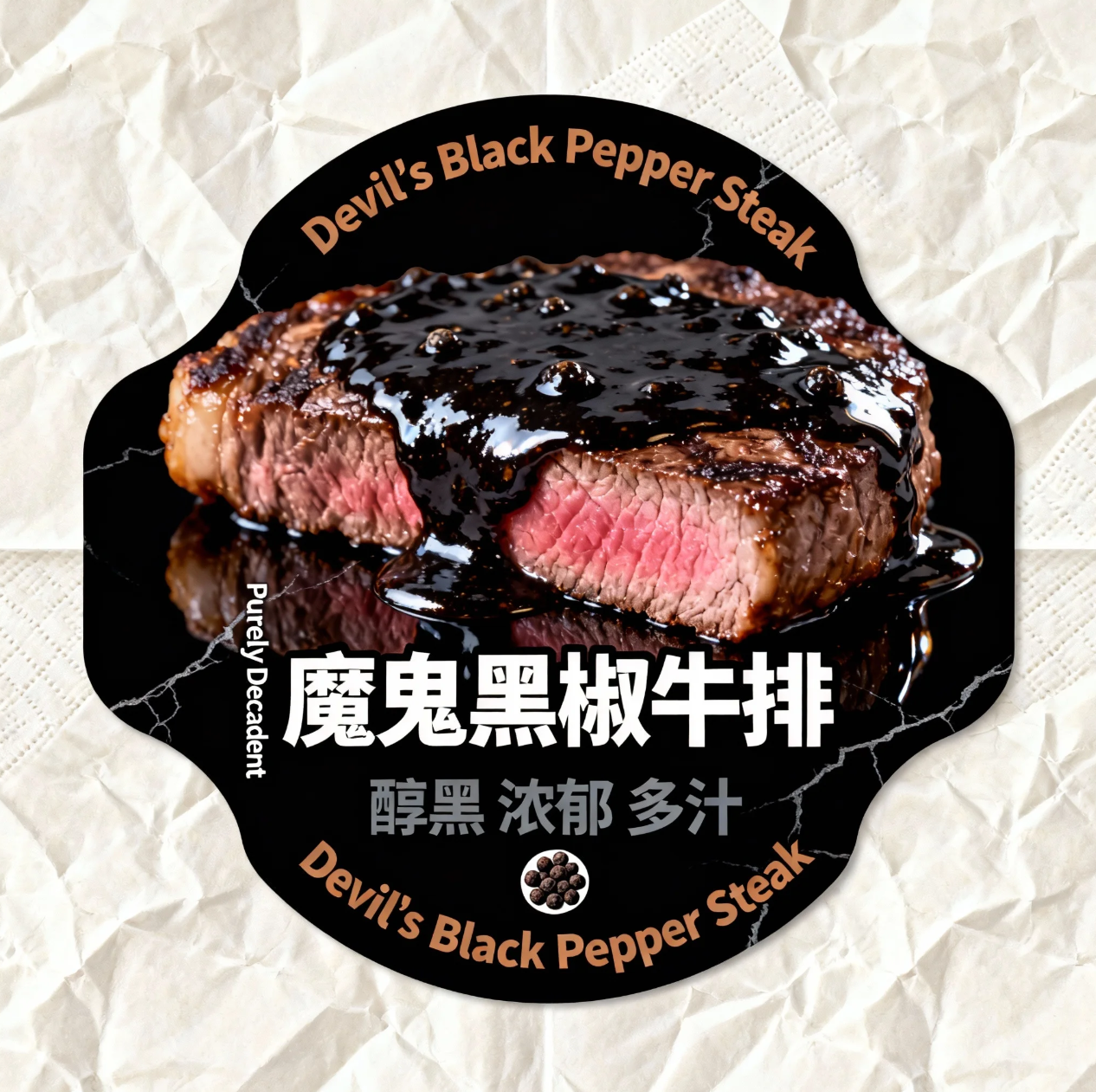 一个魔鬼黑椒牛排异形卡设计,背景是带有褶皱的米白色餐巾纸纹理。腰封主体为锋利的醇黑色 “黑椒酱汁脆片” 异形,带有镜面光泽和自然裂纹。核心展示一个被浓稠黑椒酱覆盖的西冷牛排,切面可见其多汁质地和粉嫩肉色。文字部分:顶部和底部用可可棕色现代无衬线字体标注 “Devil's Black Pepper Steak”。中间主标题:“魔鬼黑椒牛排”,采用纯白色和亮黑色组合的利落艺术字。左侧竖排:“Purely Decadent”。下方用深灰色字体标注 “醇黑 浓郁 多汁”,搭配黑椒粒图标。风格要求:极简、高级、充满诱惑力,商业摄影光感,突出牛排的纯粹与浓郁,色彩以醇黑、亮黑、米白为主,营造极致、纯粹的西餐饕餮体验。