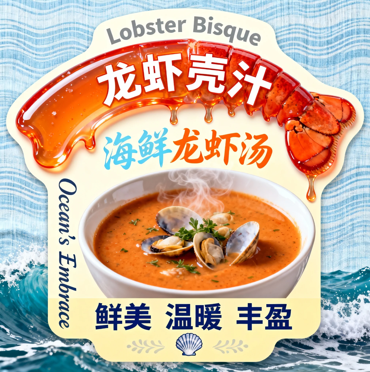 一个海鲜龙虾汤异形卡设计,背景为浅蓝波纹亚麻布,模拟海浪轻抚。腰封主体是弯曲的、晶莹的橙红色 “龙虾壳汁” 异形,动态如汤汁从龙虾壳中溢出。核心展示一碗热腾腾的龙虾汤,浮着新鲜贝类和香草,表面冒着热气。文字部分:顶部和底部用海盐灰字体标 “Lobster Bisque”。中间主标题:“海鲜龙虾汤”,采用浅蓝和橙色组合的流畅手写字体。左侧竖排:“Ocean's Embrace”。下方用深蓝字体标注 “鲜美 温暖 丰盈”,搭配贝壳图标。风格要求:活力四射、海洋主题、温暖舒适,商业摄影光感,突出海鲜的鲜活和汤汁的诱人热气,色彩以橙红、海蓝、浅黄为主,营造高端西餐的海滨度假感。