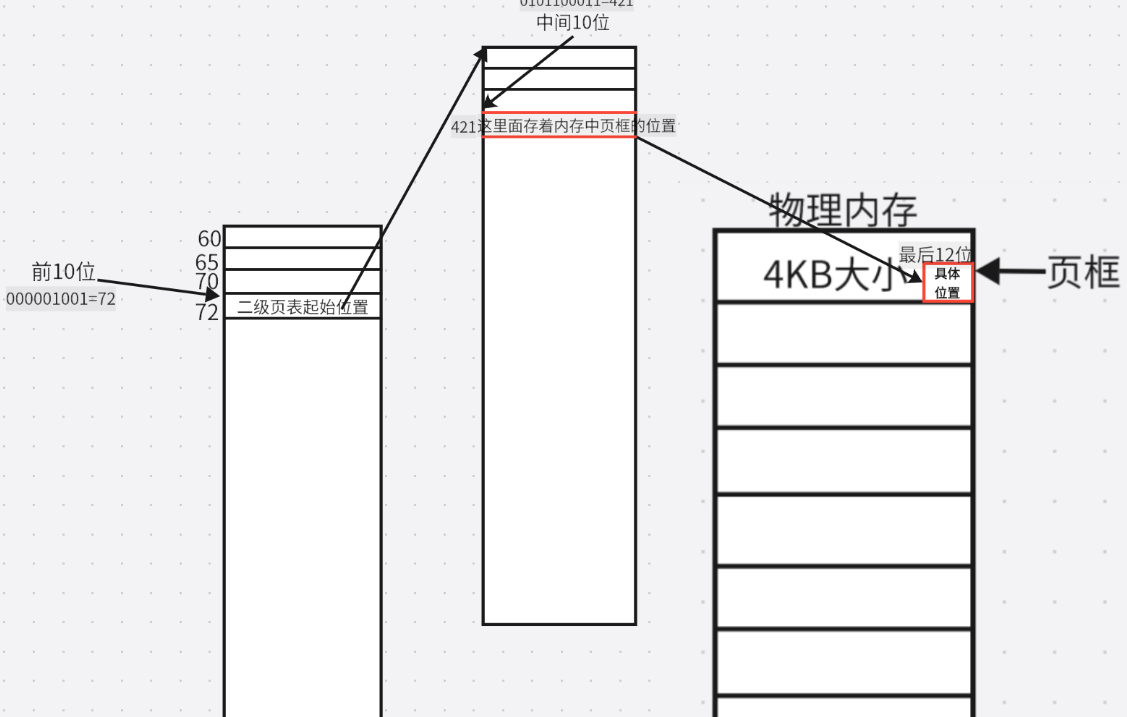 前10位对应“页目录索引”;中间10位对应“页表索引”;后12位对应“业内偏离”